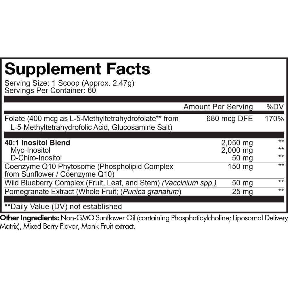 Advanced ovarian inositol supplement powder with myo inositol, D chiro inositol, and liposomal delivery.