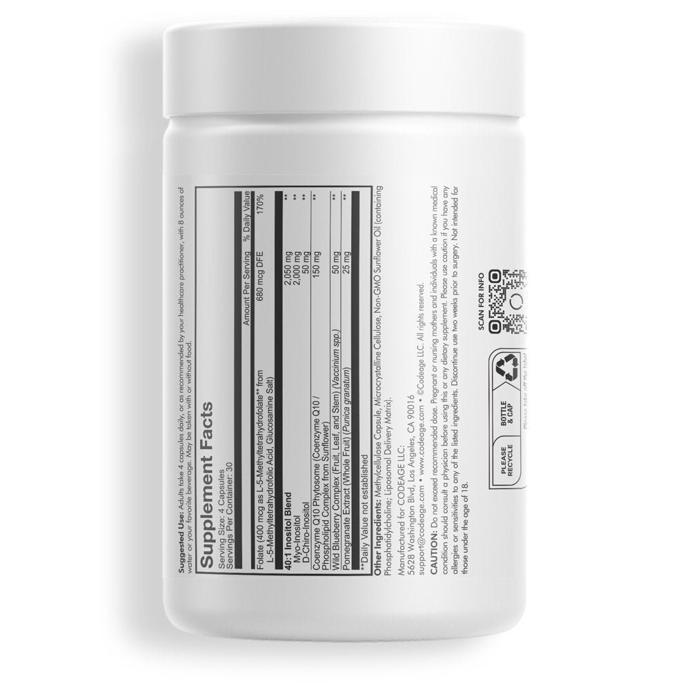 Codeage Liposomal Ovarian Inositol+ is a dietary supplement for women, formulated to help support ovarian health and hormonal balance with Myo-inositol, D-chiro-inositol, folate as 5-MTHF, CoQ10 phytosome, wild blueberry, and pomegranate extracts.* Features liposomal delivery for absorption and potency.