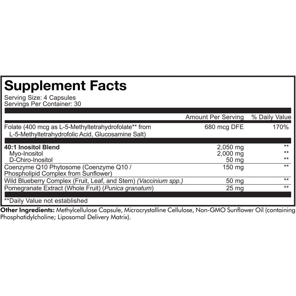 Advanced ovarian inositol supplement in capsules with myo inositol, D chiro inositol, and liposomal delivery.