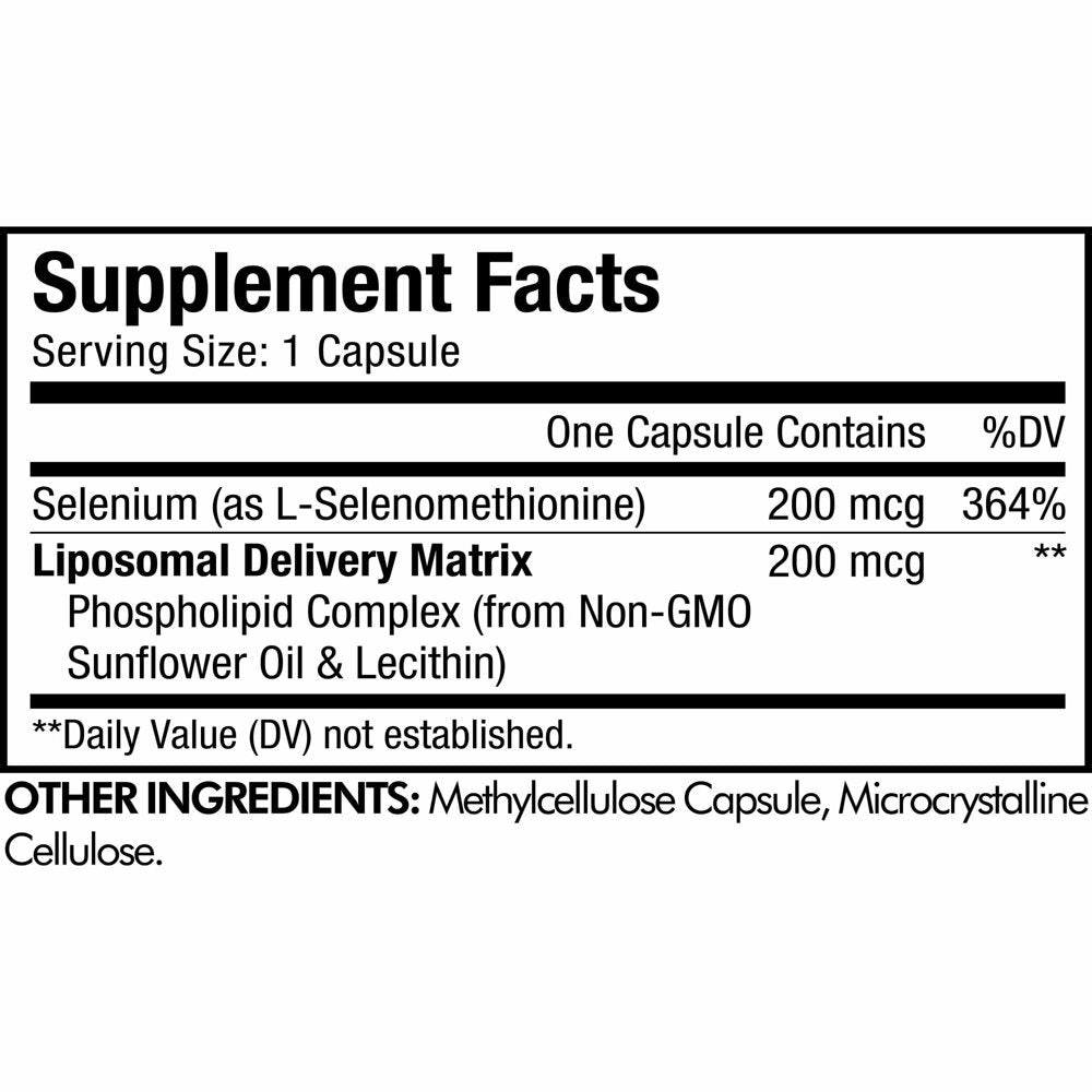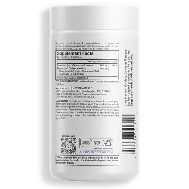 - Selenomethionine Capsule Supplement - 6-Month Supply: Codeage Liposomal Selenium capsule supplement offers 200 mcg of Selenium as L-Selenomethionine per serving, a trace mineral element with antioxidant and metabolism support properties.