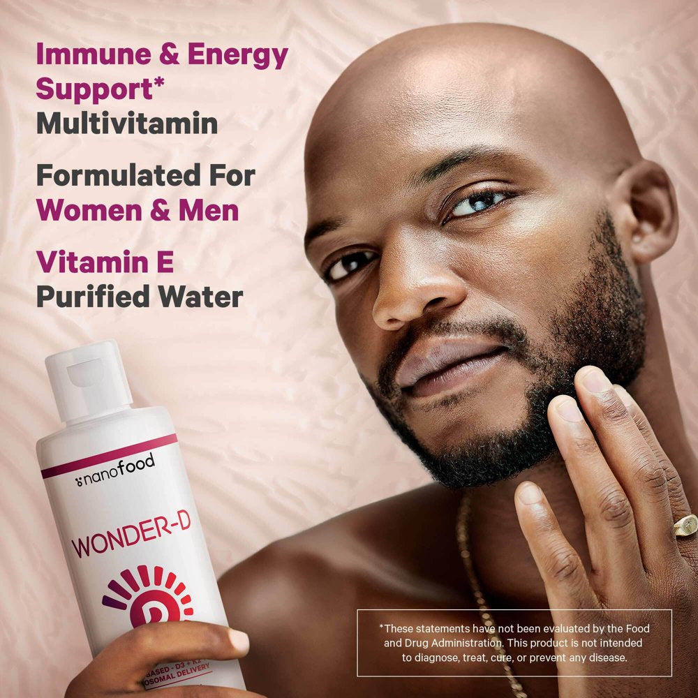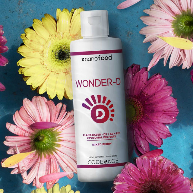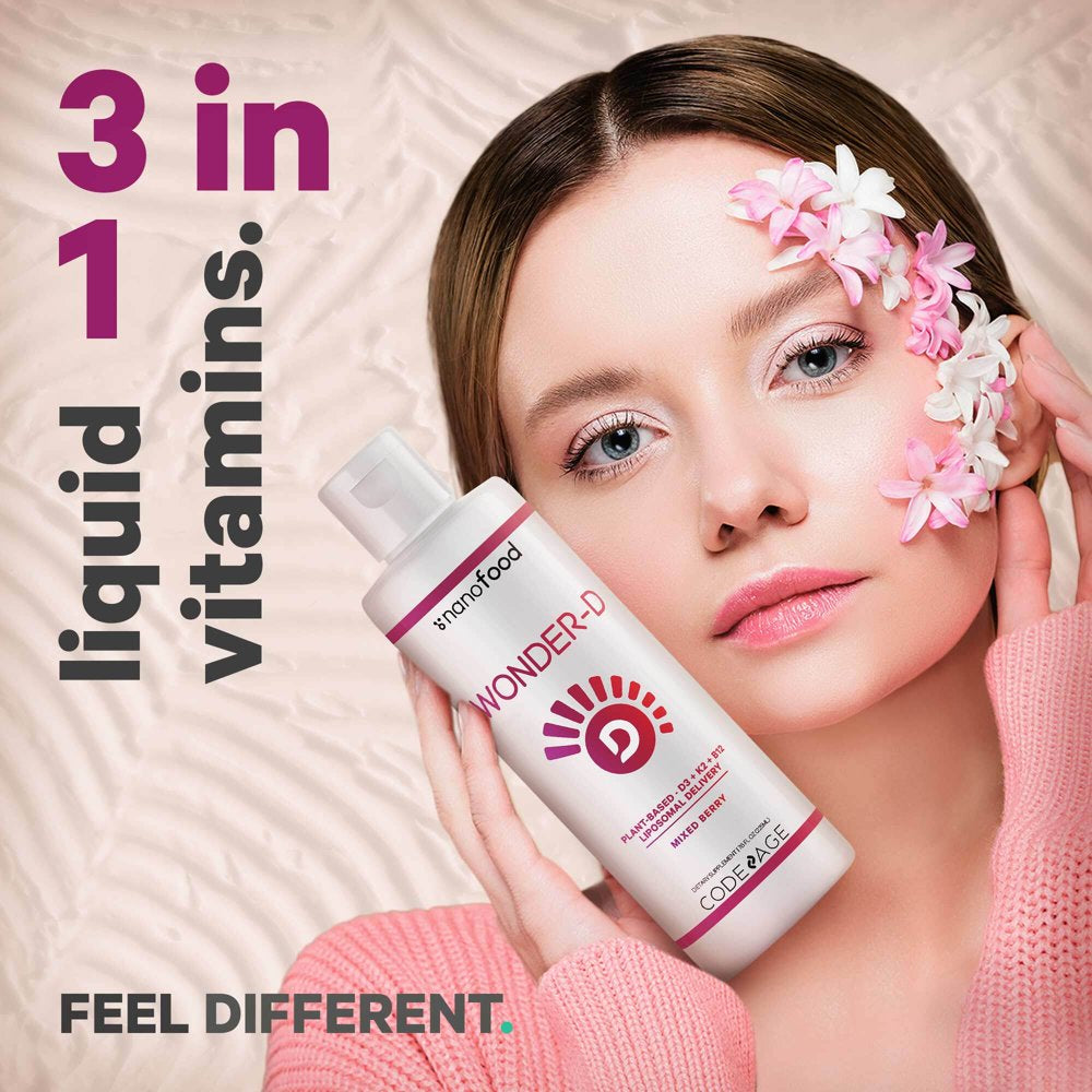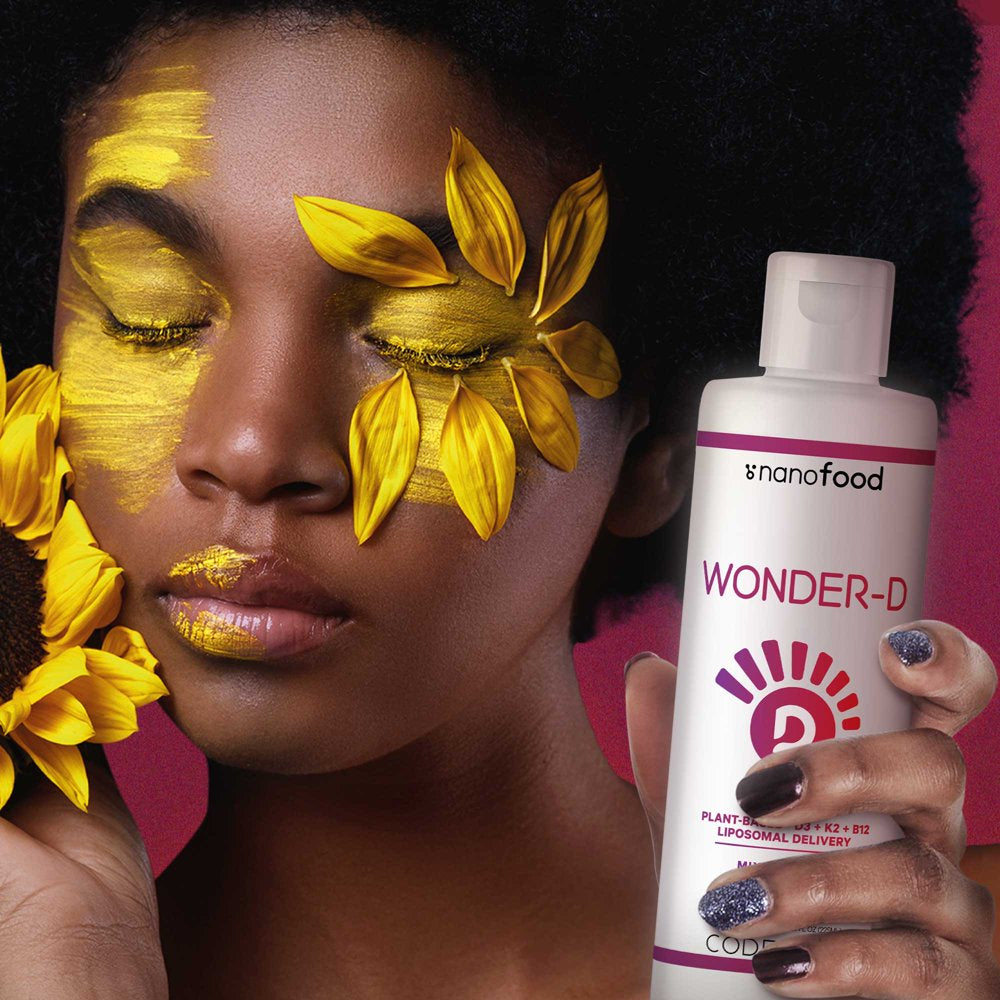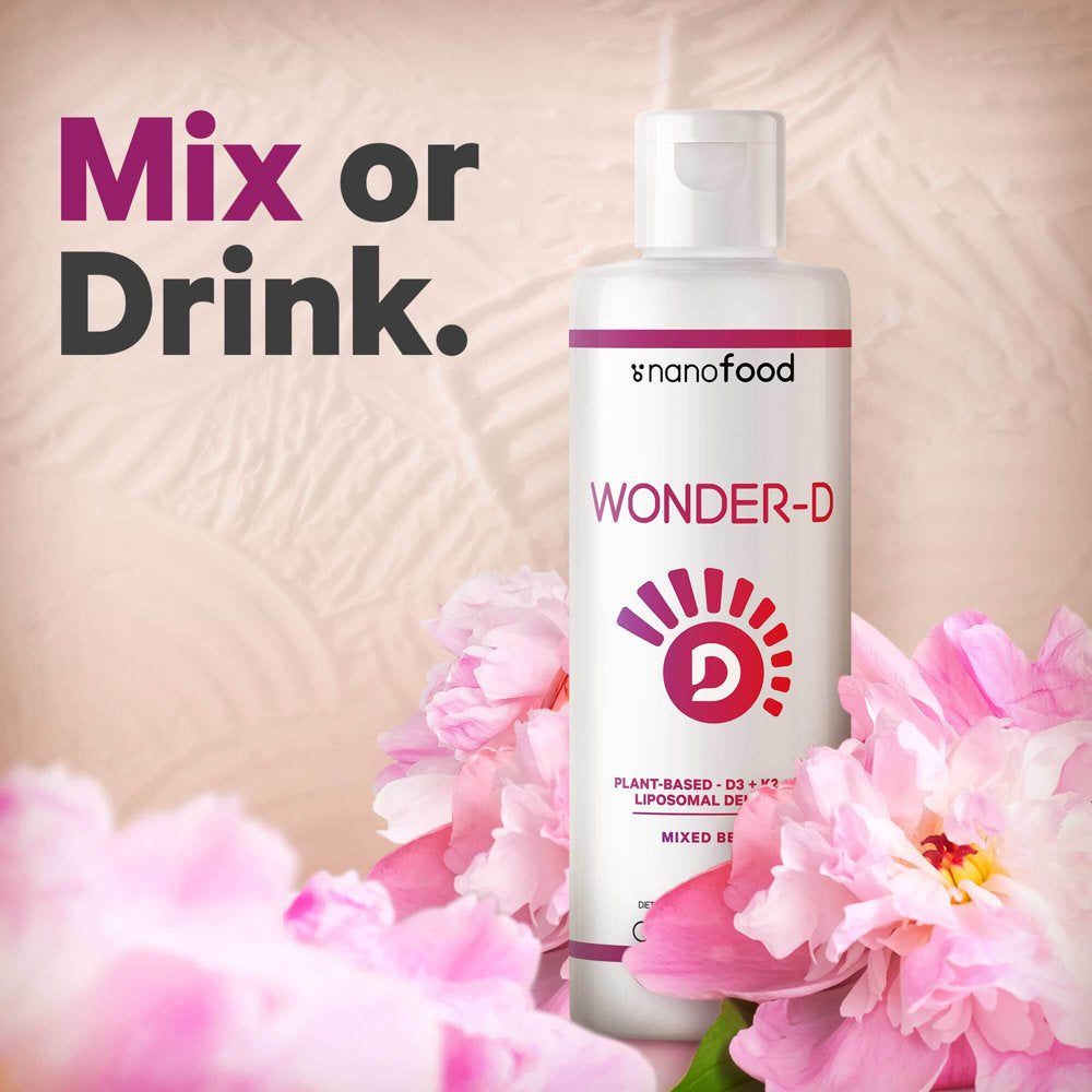 Nanofood Wonder-D liposomal blend is a vegan liquid supplement offering 1000 IU per serving of plant-based vitamin D3 combined with vegan vitamins K2 (MK-7) & B12 methylcobalamin in a tasty mixed berry flavored softgel.