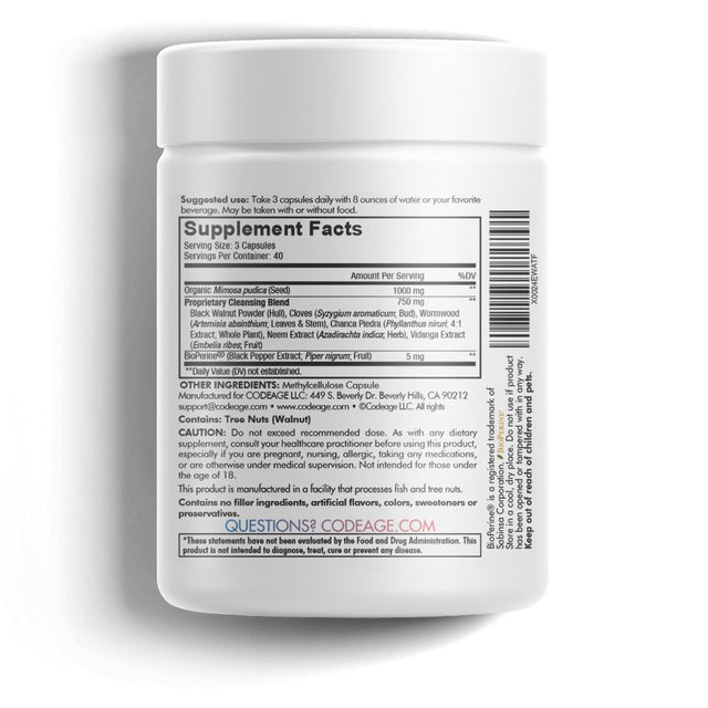 Codeage Mimosa Pudica + is made with the following natural ingredients: Organic mimosa pudica seed, black walnut powder, cloves, wormwood, chanca piedra, neem extract, vidanga extract, and BioPerine black pepper extract.
