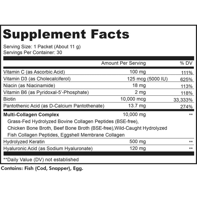 - This advanced collagen powder formula contains nutrients like biotin 10,000mcg, keratin, vitamin B6, vitamin C, vitamin D3, hyaluronic acid, niacin, and pantothenic acid to help support healthy hair, skin, nails, joints, bones, and overall wellness.*