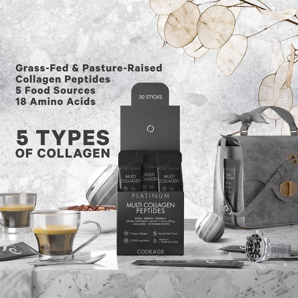 - Codeage Multi Collagen Platinum stick packs provide a premium and convenient way to incorporate collagen into your daily routine with a unique blend of 5 types of collagen peptides from 5 different food sources, grass-fed collagen, wild-caught marine collagen, and 18 amino acids all-in-one.