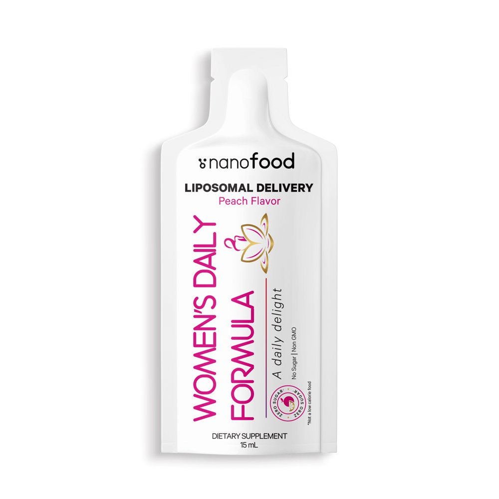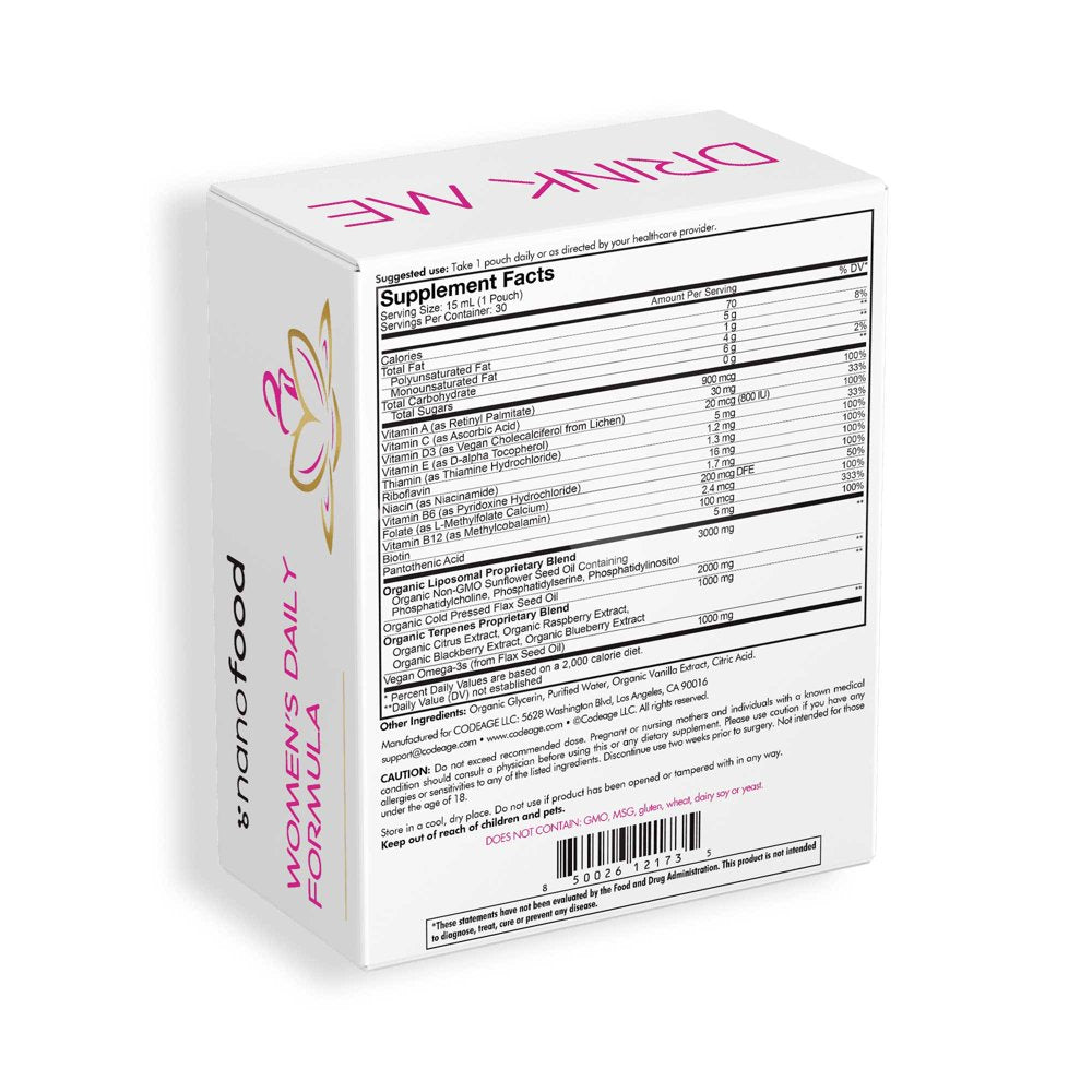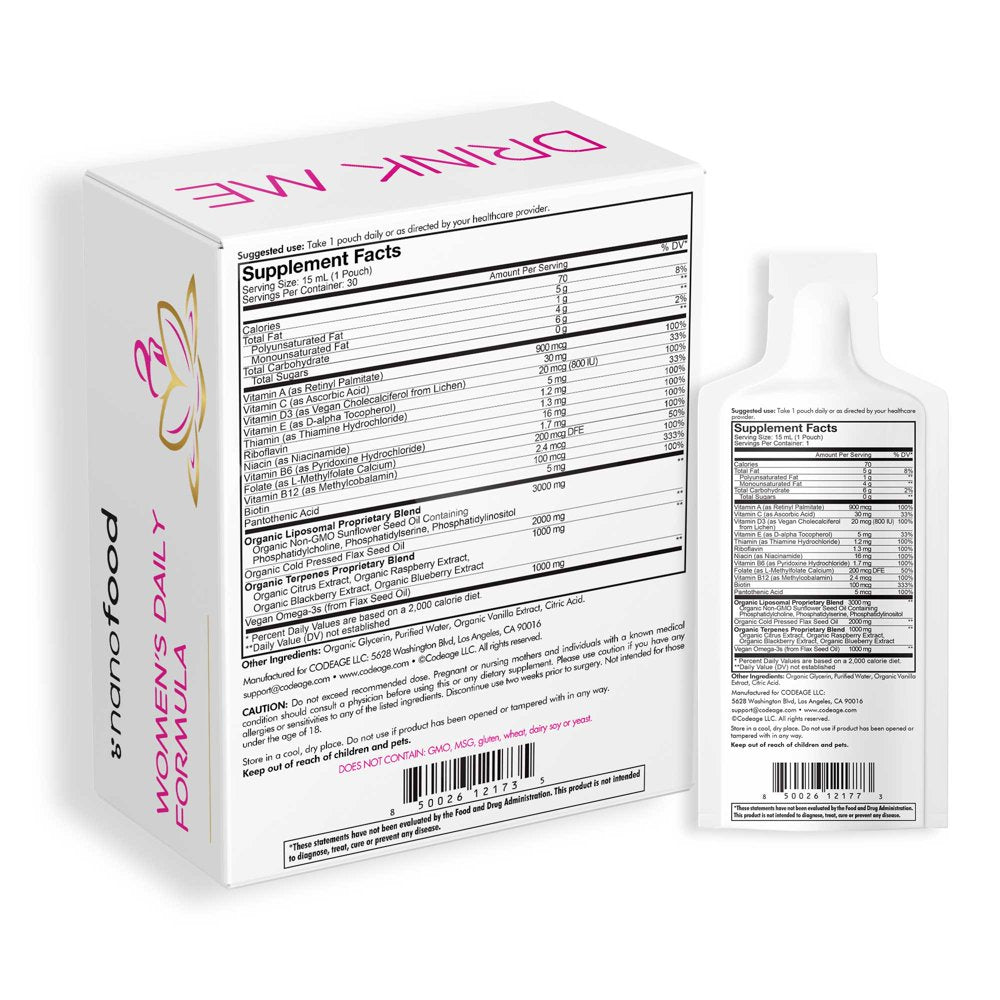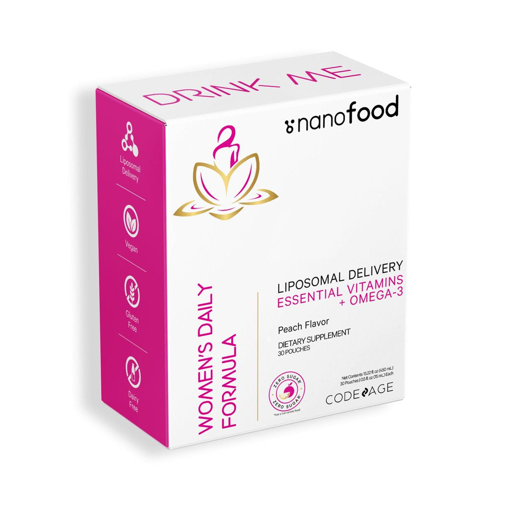 - Drinkable Women's Multivitamin in Sachet - 1 Pouch Daily: Codeage Nanofood Women's Daily Vitamins pouch supplement provides vegan vitamins A, B, C, D3 & E with omega-3s, phospholipids, and organic fruit extracts in a delightful peach flavor.