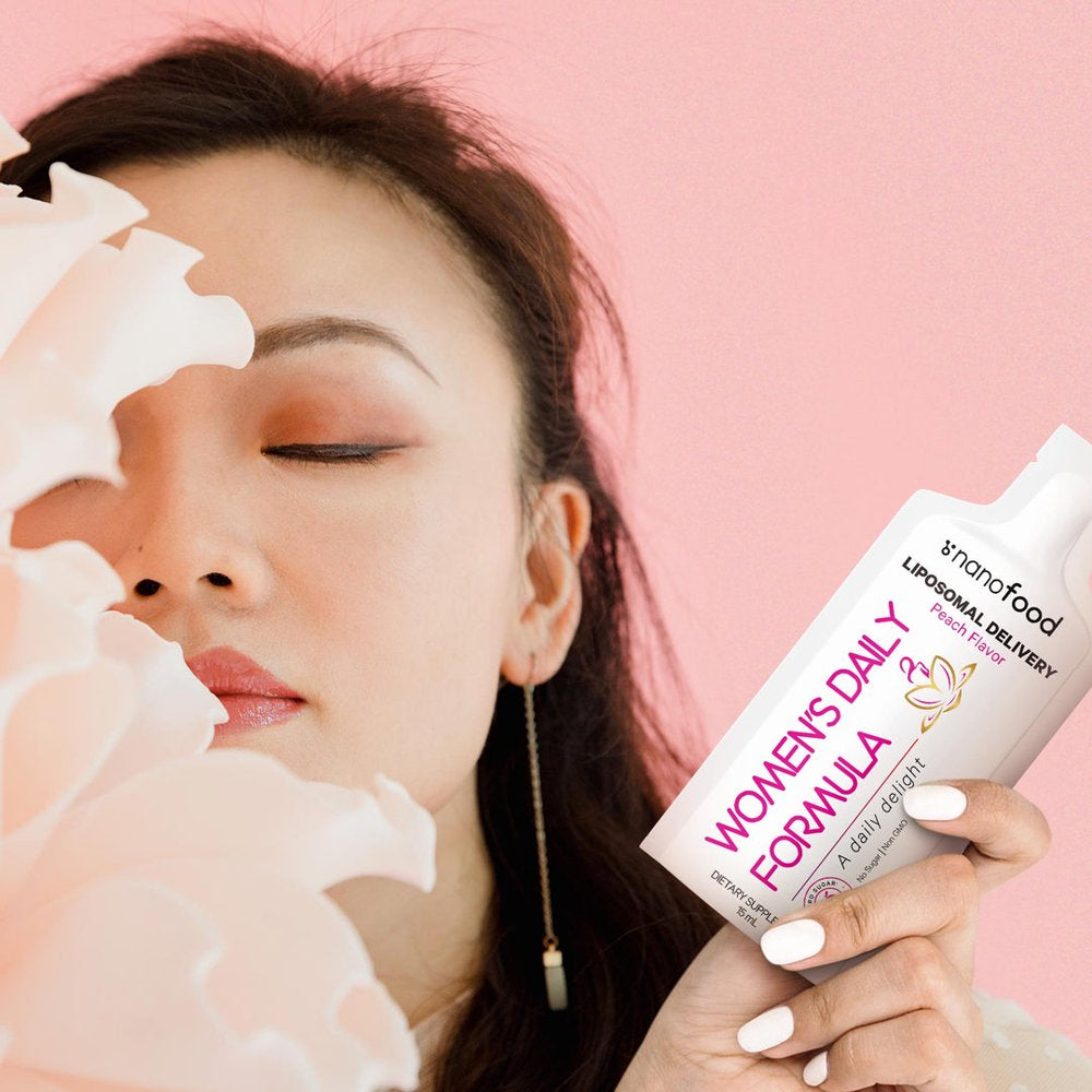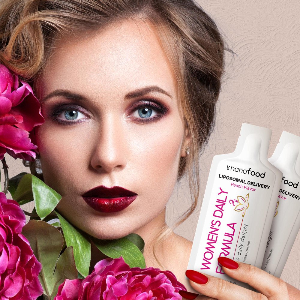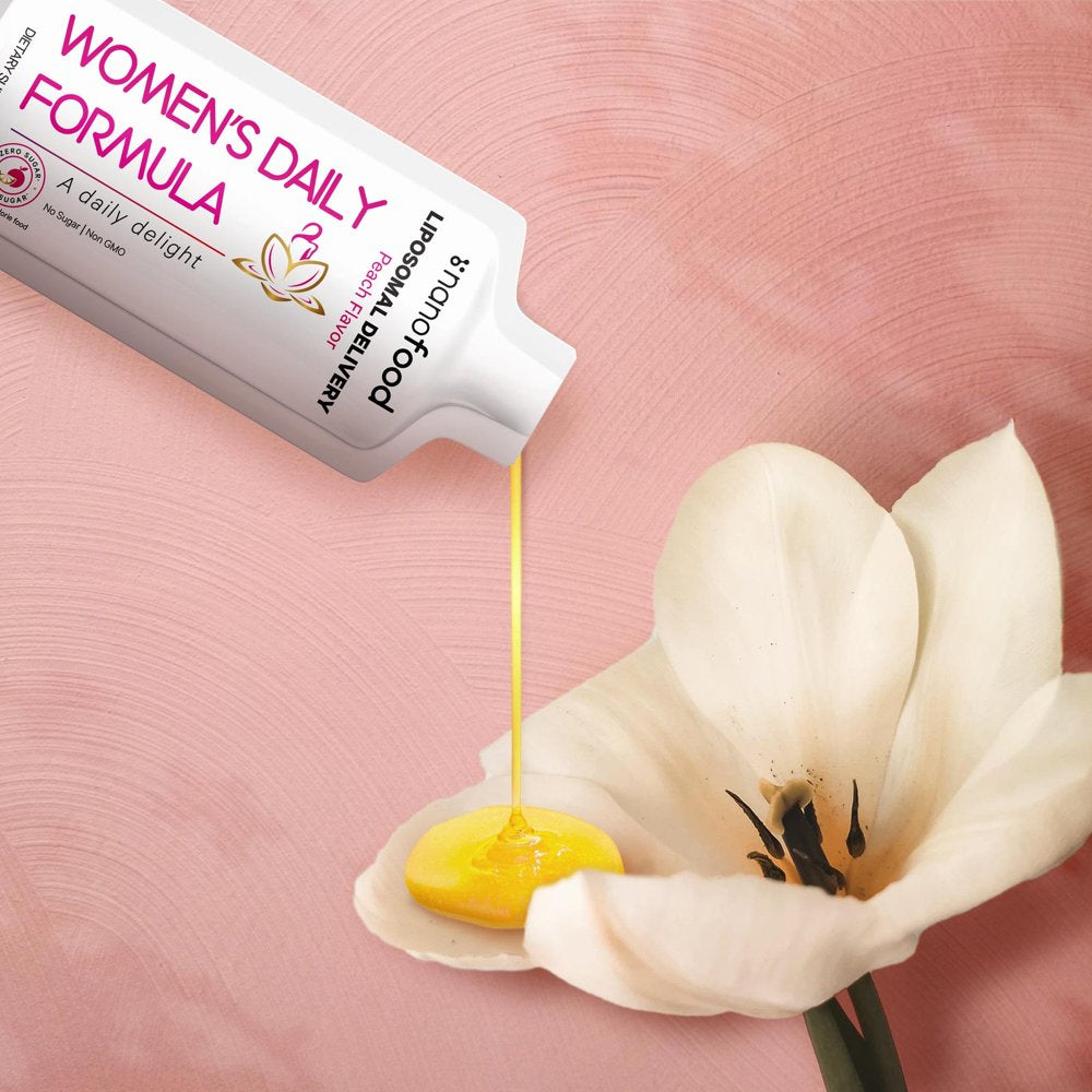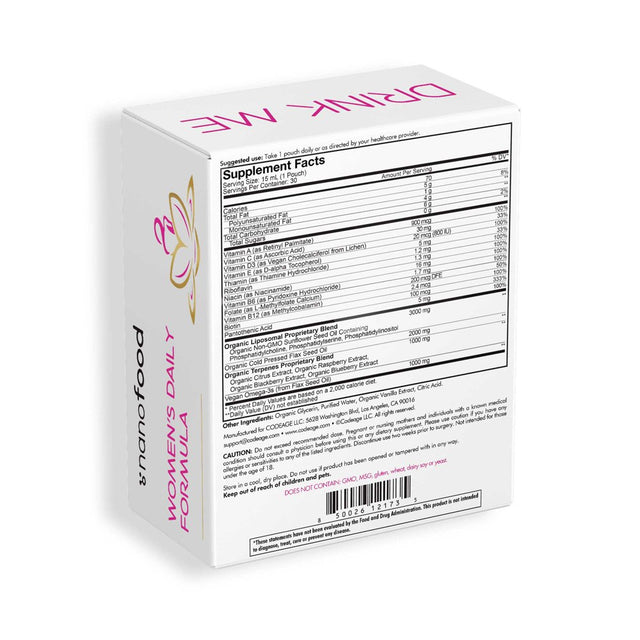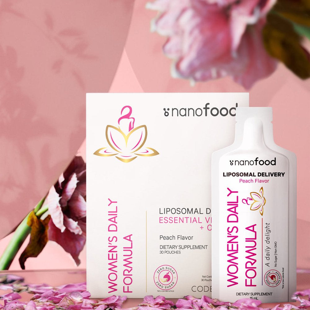 - Drinkable Women's Multivitamin in Sachet - 1 Pouch Daily: Codeage Nanofood Women's Daily Vitamins pouch supplement provides vegan vitamins A, B, C, D3 & E with omega-3s, phospholipids, and organic fruit extracts in a delightful peach flavor.