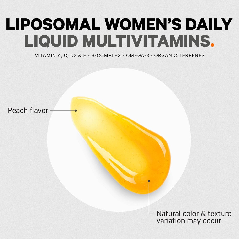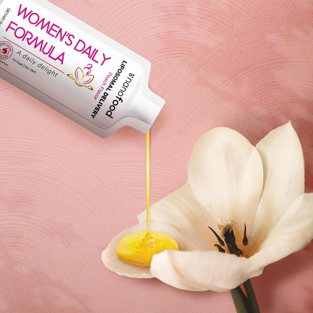 Codeage Nanofood Liposomal Women's Daily Multivitamin vegan formula delivers essential vitamins A, B, C, D3 & E with plant-based omega-3s, phospholipids, and organic fruit extracts all-in-one in a delightful peach flavored liquid pouch.