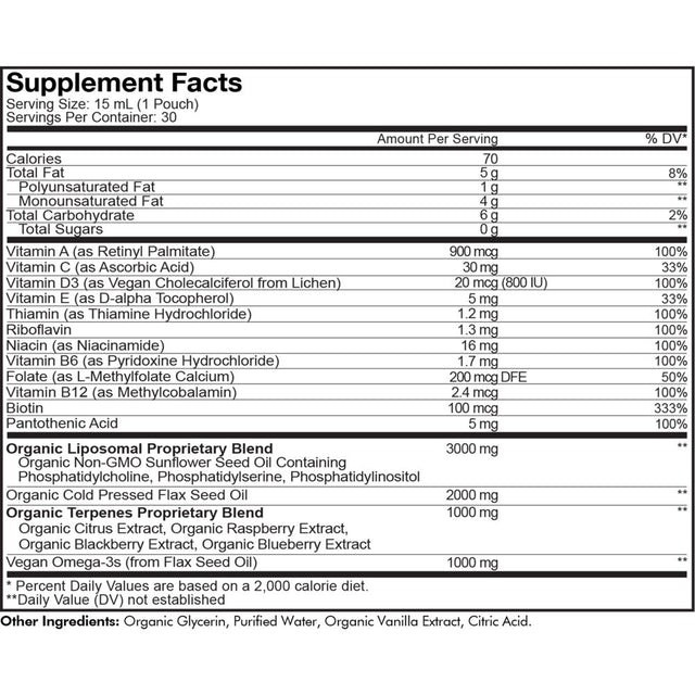 Nanofood Women's Daily liquid pouch formula contains all the essential B vitamins like biotin, B6, B12, thiamin, riboflavin, niacin, pantothenic acid, folate, and includes a liposomal phospholipid complex from organic and non-GMO sunflower seed oil.