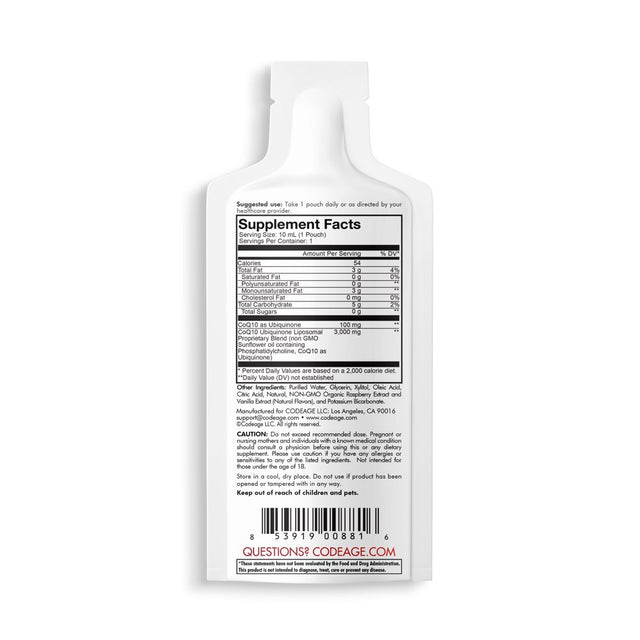 - CoQ10 as Ubiquinone: Codeage Wonder Heart Nanofood offers 30 pouches of CoQ10 per box. This Liposomal Coenzyme Q10 formula comes in an easy-to-use format. Each pouch of Codeage heart liquid vitamin supplement delivers 100 mg of CoQ10 as Ubiquinone. This CoQ10 liquid formula is designed for both men and women and is convenient to drink. coenzyme Q10 daily.
