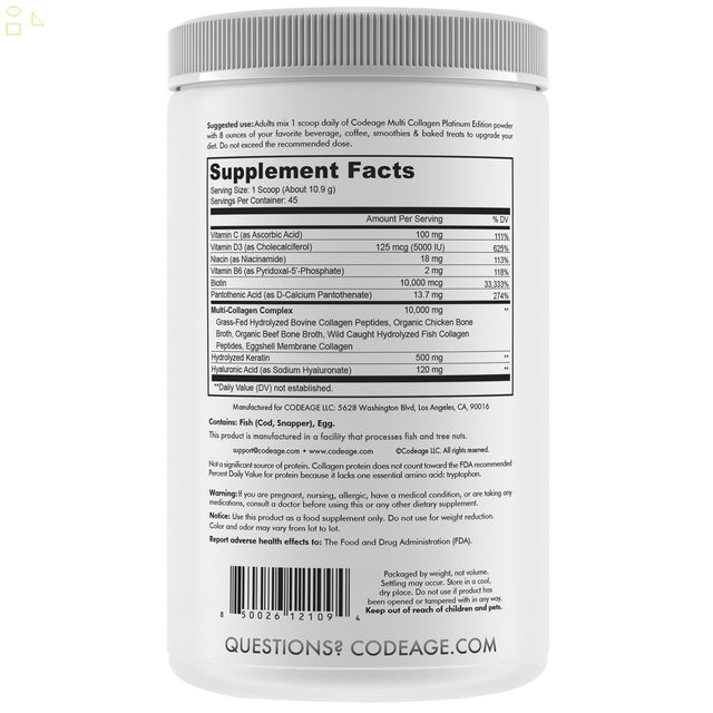 Codeage Platinum Multi Collagen Peptides Powder, 45 Servings | Biotin and Keratin