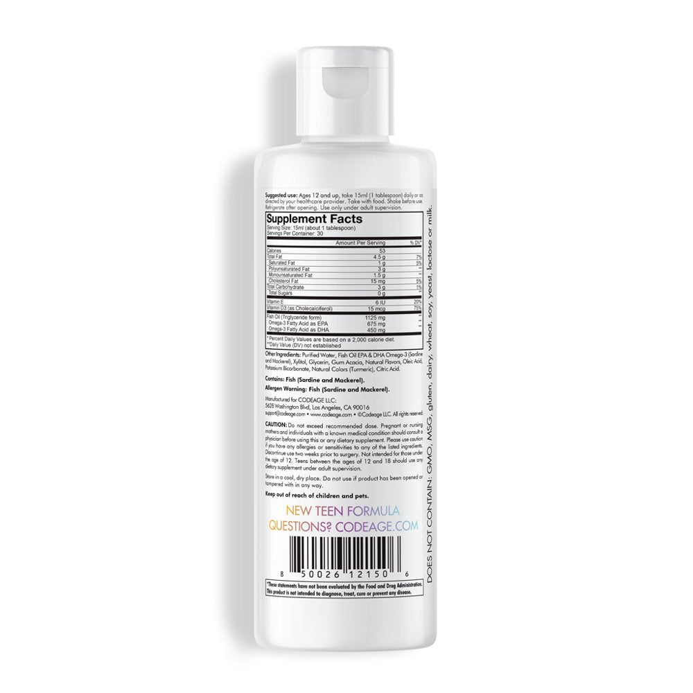 Featured in a ready-to-drink and easy-to-squeeze bottle, Codeage Teen Omega + supplement offers 1125 mg per serving of liquid fish oil with omega-3 essential fatty acids EPA & DHA. This omega-rich fish oil formula comes in delicious and lemonade-flavored liquid drops.