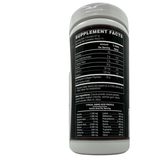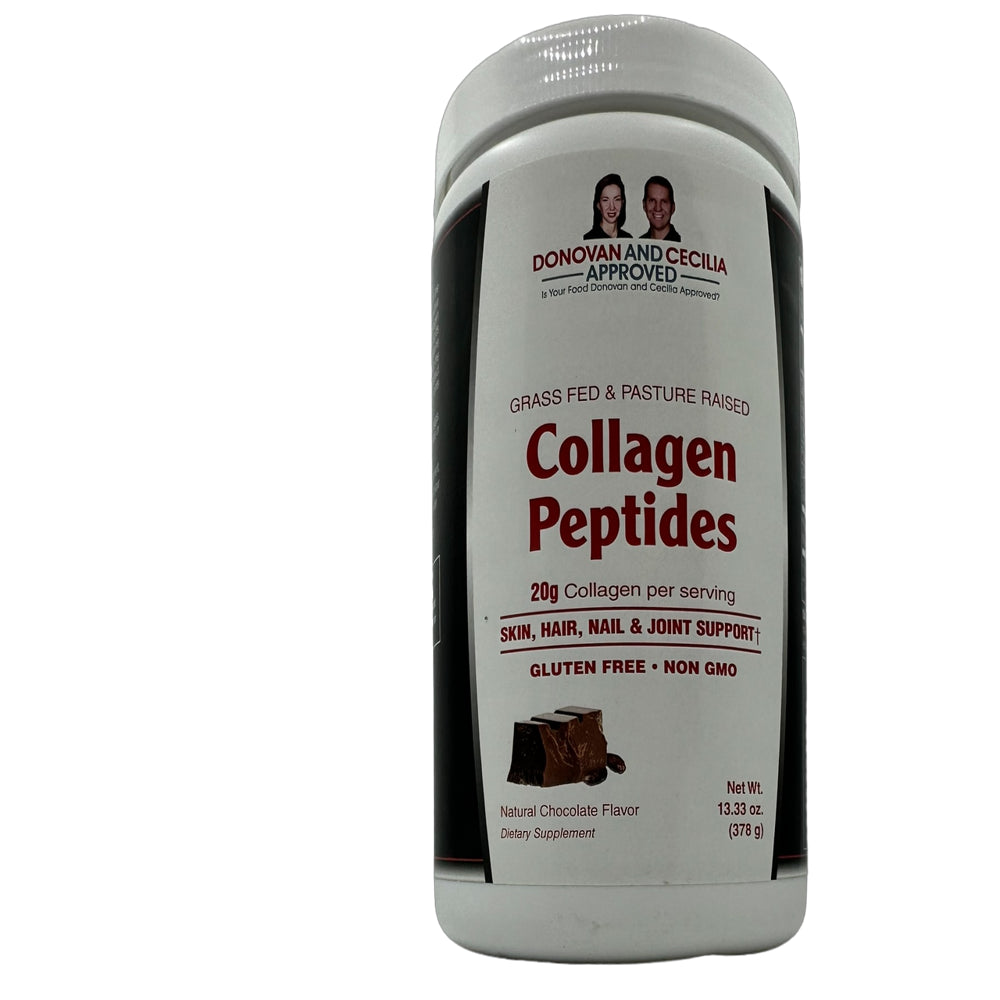 Grass-Fed and Pasture-Raised Chocolate Collagen Peptides. Provides 20g of Grass-Fed, Non-GMO bovine collagen peptides per serving in delicious chocolate flavor. No gluten, dairy, or soy. Collagen is the most abundant protein in the body and is the main component of connective tissue. It is the tough, fibrous protein in hair, nails, tendons, ligaments, and skin. Collagen helps preserve the elastin in the skin, helping it to stay toned and supple, and collagen also gives tendons and ligaments their toughness. As we age, our body begins producing less collagen, which is one reason why skin starts to sag and joints become achy. Our Collagen Peptides Powder is hydrolyzed and contains types 1 & 3 collagen which supports skin, muscles, and bone health.† Hydrolyzed collagen is easier to absorb, allowing the amino acids to be utilized more efficiently. Collagen Peptides Powder is rich in the amino acids glycine, proline, hydroxyproline, and alanine which help promote collagen synthesis in our body. Features * 20g Collagen Peptides per serving * Grass-fed & pasture-raised bovine collagen * Hydrolyzed type 1 & 3 * Collagen Non-GMO * Simple and Clean Ingredients * Delicious Chocolate Flavor (Also available in Vanilla and Unflavored) Benefits * Supports a healthy inflammation response.† * Supports joint function and mobility.† * May support health of the lining of the intestinal tract.† * Strengthens connective tissue and helps aid recovery from physical stress or trauma.† * Strengthens extracellular matrix and helps to form fibroblast to create new skin cells.† * Helps to strengthen and firm elastin in the dermis layer of skin, providing an anti-aging effect.† * Mixes instantly No Gluten, Dairy, or Soy No fillers or Artificial Ingredients post-workout. About us. Donovan and Cecilia Approved products use our strict and science-based approach to find clean supplements for your healthy lifestyle goals. † These statements have not been evaluated by The Food and Drug Administration. This product is not intended to diagnose, treat, cure or prevent any disease.