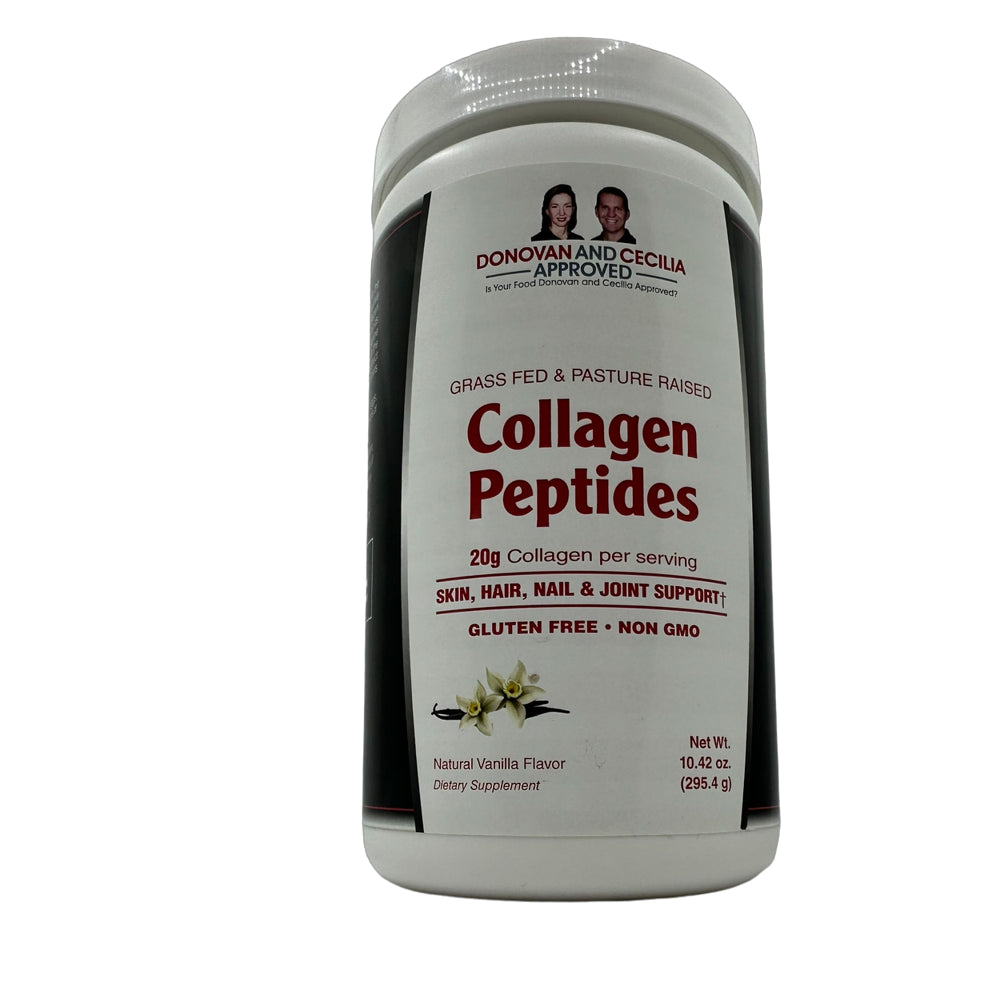 Grass-Fed and Pasture-Raised Vanilla Collagen Peptides. Provides 20g of Grass-Fed, Non-GMO bovine collagen peptides per serving in delicious vanilla flavor. No gluten, dairy, or soy and is a great base flavor for strawberries, blueberries, and other fruit smoothies. Collagen is the most abundant protein in the body and is the main component of connective tissue. It is the tough, fibrous protein in hair, nails, tendons, ligaments, and skin. Collagen helps preserve the elastin in the skin, helping it to stay toned and supple, and collagen also gives tendons and ligaments their toughness. As we age, our body begins producing less collagen, which is one reason why skin starts to sag and joints become achy. Our Collagen Peptides Powder is hydrolyzed and contains types 1 & 3 collagen which supports skin, muscles, and bone health.† Hydrolyzed collagen is easier to absorb, allowing the amino acids to be utilized more efficiently. Collagen Peptides Powder is rich in the amino acids glycine, proline, hydroxyproline, and alanine which help promote collagen synthesis in our body. Features * 20g Collagen Peptides per serving * Grass-fed & pasture-raised bovine collagen * Hydrolyzed type 1 & 3 * Collagen Non-GMO * Simple and Clean Ingredients * Delicious Vanilla Flavor (Also available in Chocolate and Unflavored) Benefits * Supports a healthy inflammation response.† * Supports joint function and mobility.† * May support the health of the lining of the intestinal tract.† * Strengthens connective tissue and helps aid recovery from physical stress or trauma.† * Strengthens extracellular matrix and helps to form fibroblast to create new skin cells.† * Helps to strengthen and firm elastin in the dermis layer of skin, providing an anti-aging effect.† * Mixes instantly No Gluten, Dairy, or Soy No fillers or Artificial Ingredients post-workout. About us. Donovan and Cecilia Approved products use our strict and science-based approach to find clean supplements for your healthy lifestyle goals. † These statements have not been evaluated by The Food and Drug Administration. This product is not intended to diagnose, treat, cure or prevent any disease.