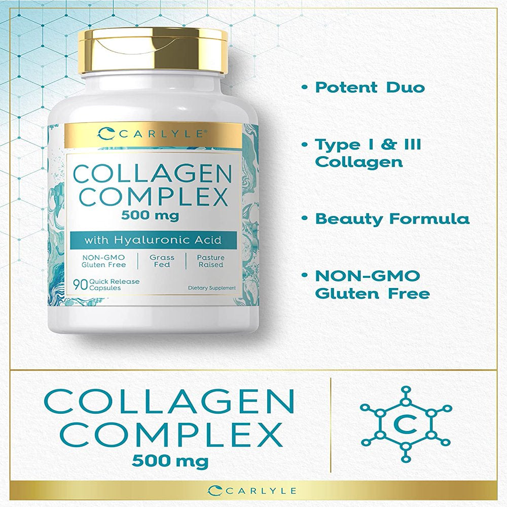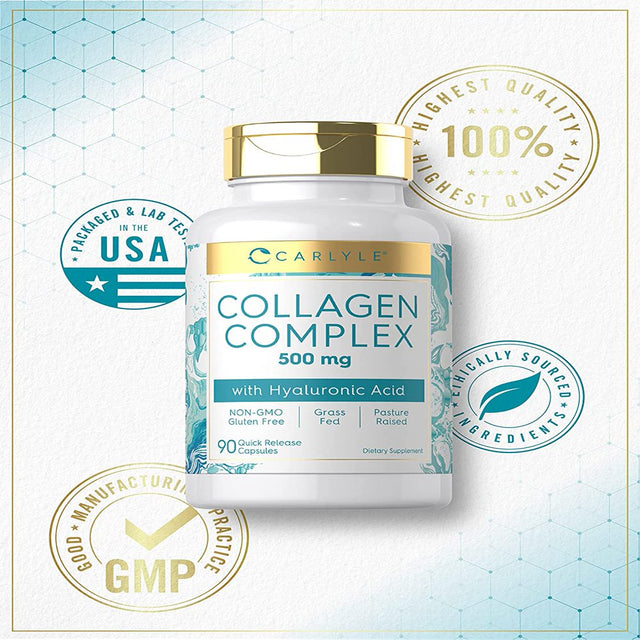 Collagen with Hyaluronic Acid 500Mg | 90 Capsule Pills | Hydrolyzed Collagen Supplement | Non-Gmo, Gluten Free | by Carlyle
