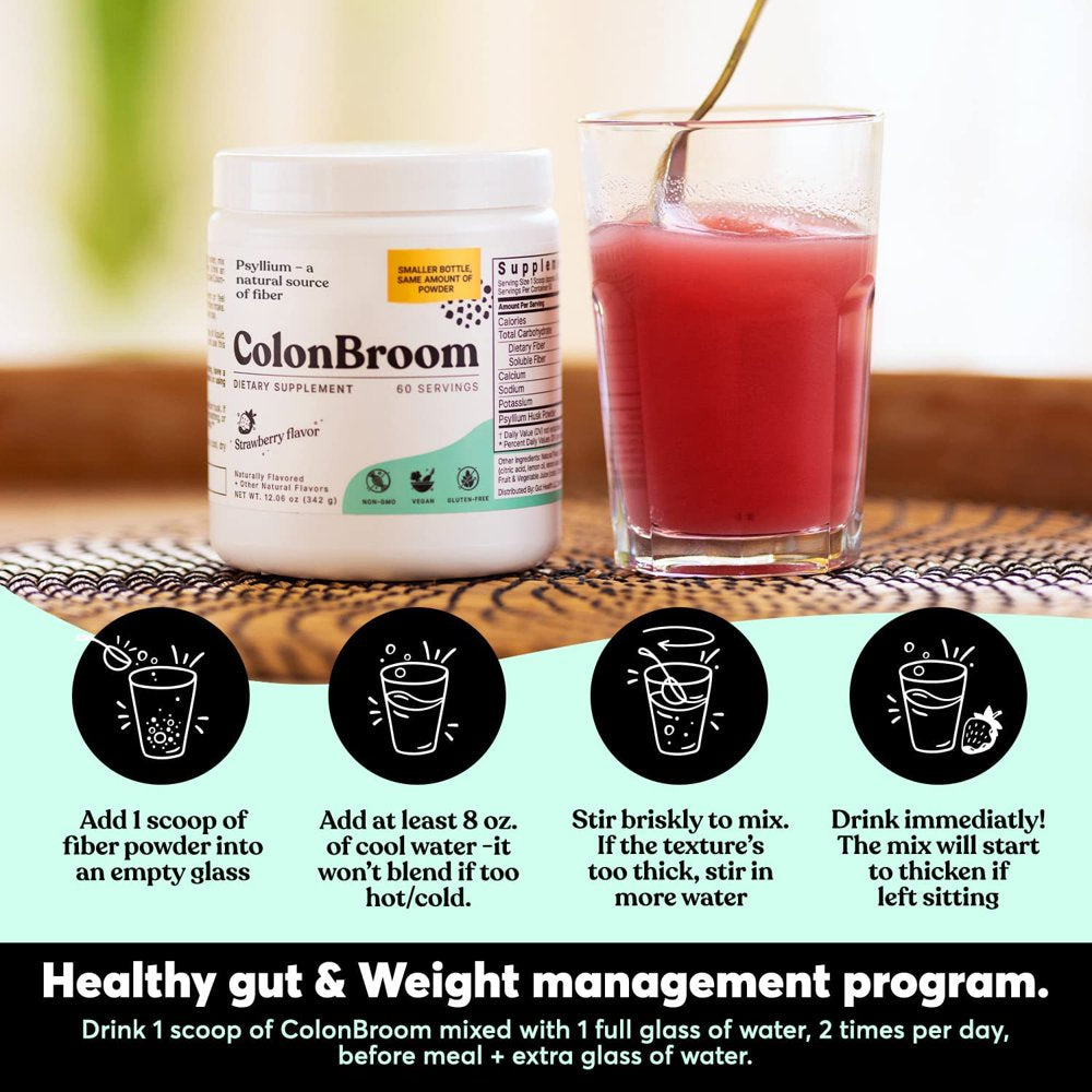 BERRY YUMMY FIBER BOOST - A refreshing strawberry flavored Colon Broom drink that leaves you feeling lighter inside. Mix 1 scoop of psyllium powder with 12-14 fl oz of water - shake very well and drink immediately. If it’s left out the texture will get too thick.- BLENDED IN THE USA - ColonBroom psyllium husk fiber supplements are blended in the USA and have over 100,000 HAPPY CUSTOMERS. This SUGAR FREE, VEGAN, NON-GMO digestive supplement is going to be your go-to drink for a happy colon cleanse.