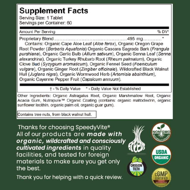 - Approx. 60 Servings! Made with organic, wildcrafted and consciously cultivated ingredients: Organic Cape Aloe Leaf, Organic Oregon Grape Root Powder, Organic Cascara Sagrada Bark, Organic Garlic Bulb, Organic Senna Leaf, Organic Turkey Rhubarb Root, Organic Clove Bud, Organic Fennel Seed, Organic Ginger Root, Wildcrafted Black Walnut Hull, Organic Wormwood Herb, Organic Cayenne Pepper Fruit ✓ BPA Free