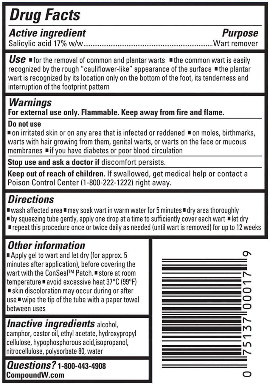 Compound W Maximum Strength Fast Acting Gel penetrates to remove common and plantar warts Features a no-drip liquid salicylic acid formula with an easy, on-the-go tube application Convenient, super adhesive, waterproof ConSeal Patches discreetly hide warts and prevent them from spreading Compound W is the #1 most trusted and dermatologist-recommended wart removal brand* *52 week national IRI panel data ending 1/24/21 and IQVIA ProVoice survey 12/1/19-11/30/20 Contains 1 tube of Maximum Strength Fast Acting Gel Wart Remover, 0.25 oz and 12 ConSeal Patches; for use by adults and children 3 years of age or older