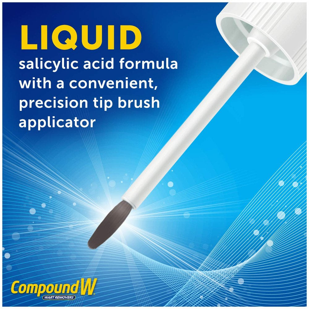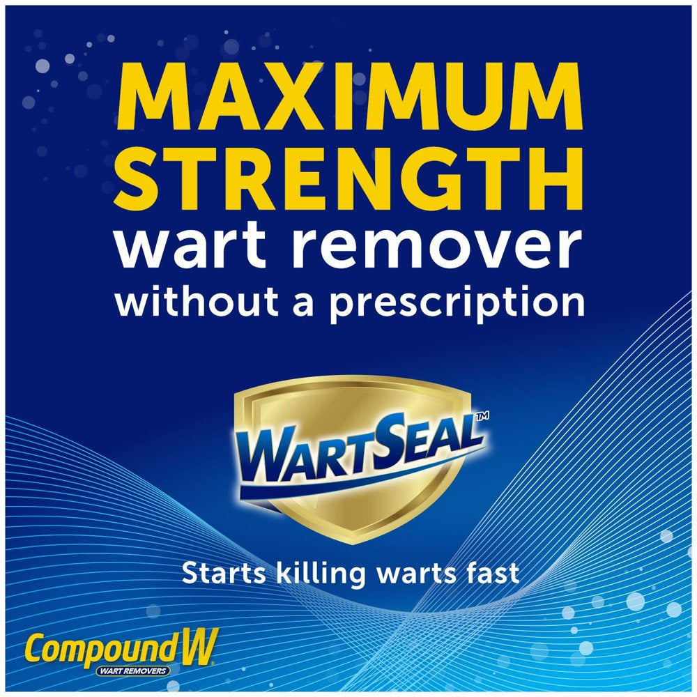 Compound W Maximum Strength Fast Acting Liquid effectively removes common and plantar warts Fast Acting Liquid with WartSeal starts working instantly and is a maximum strength wart remover without a prescription Maximum strength wart remover without a prescription Compound W is the #1 most trusted and dermatologist-recommended wart removal brand National Consumer Panel 52 Week Data: 1/28/2018, 1/27/2019, 1/26/2020 and IQVIA Claim Substantiation Validation Statement, 12/11/18 - 11/30/19 Contains 1 pack of 10 medicated strips; safe for use on kids ages 3+