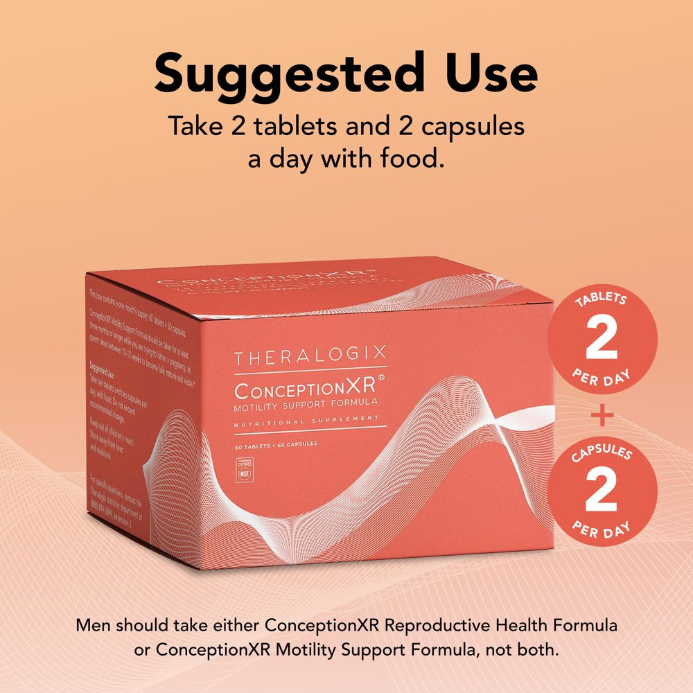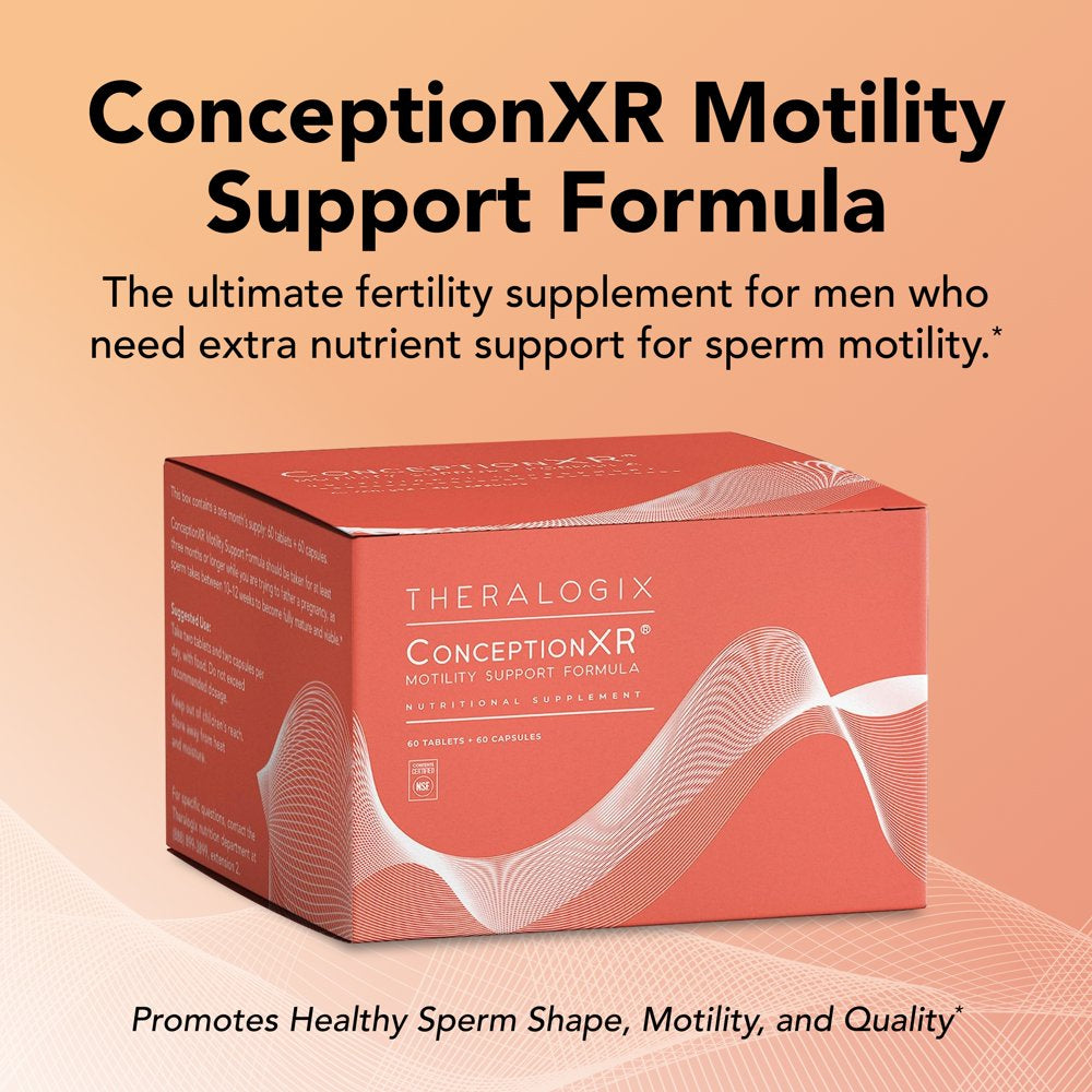 ConceptionXR Motility Support Formula is a safe, evidence-based male fertility supplement designed to support healthy sperm function and motility (movement).* ConceptionXR tablets are formulated to provide an extended release of nutrients. Theralogix nutritional supplements are recommended for use under the supervision of your healthcare provider. Artificial dye-free and gluten-free. Independently tested and certified by NSF International for content accuracy, purity and freedom from contaminants. *These statements have not been evaluated by the Food and Drug Administration. This product is not intended to diagnose, treat, cure or prevent any disease.