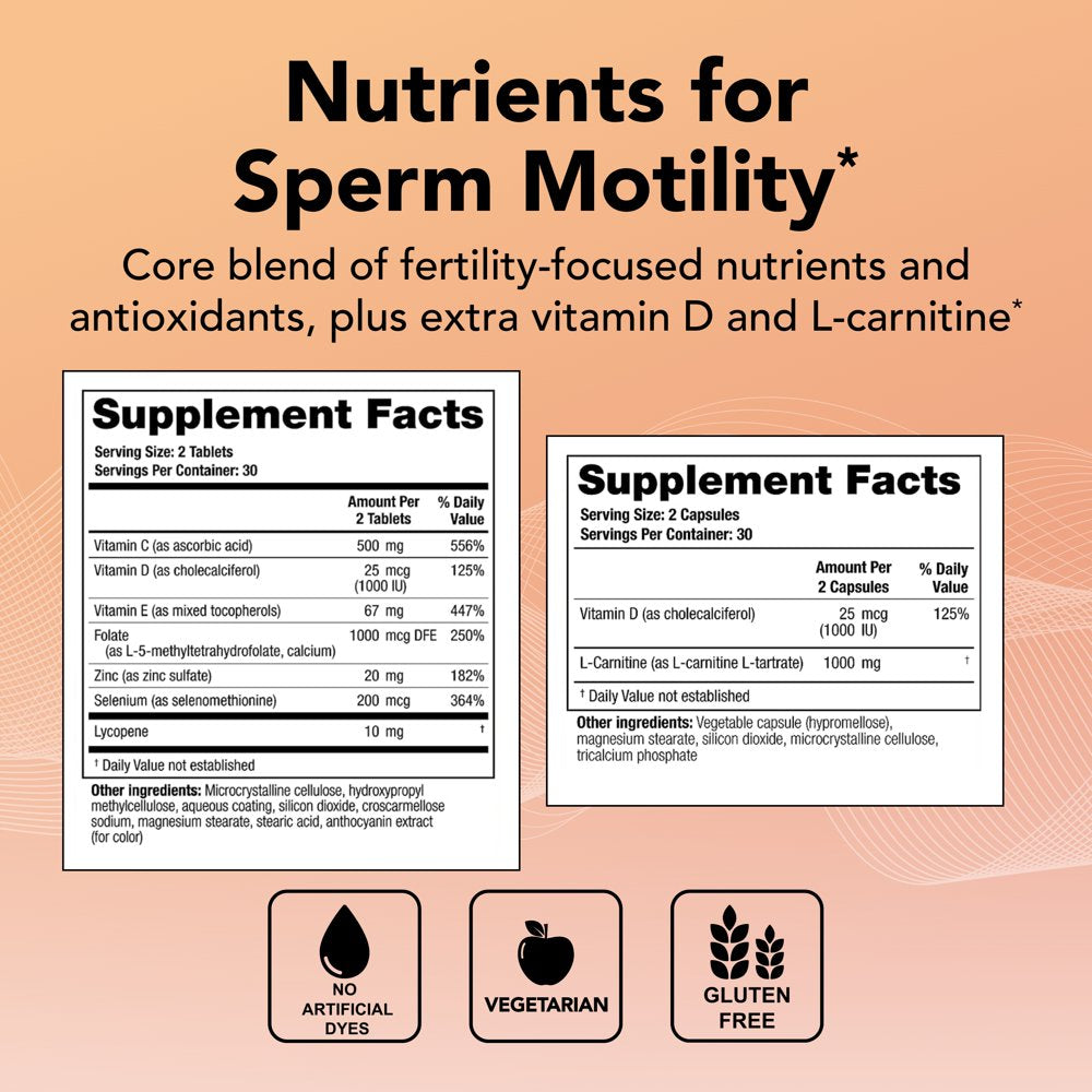 - Includes a higher dose of vitamin D and L-carnitine, which both support healthy sperm motility.*