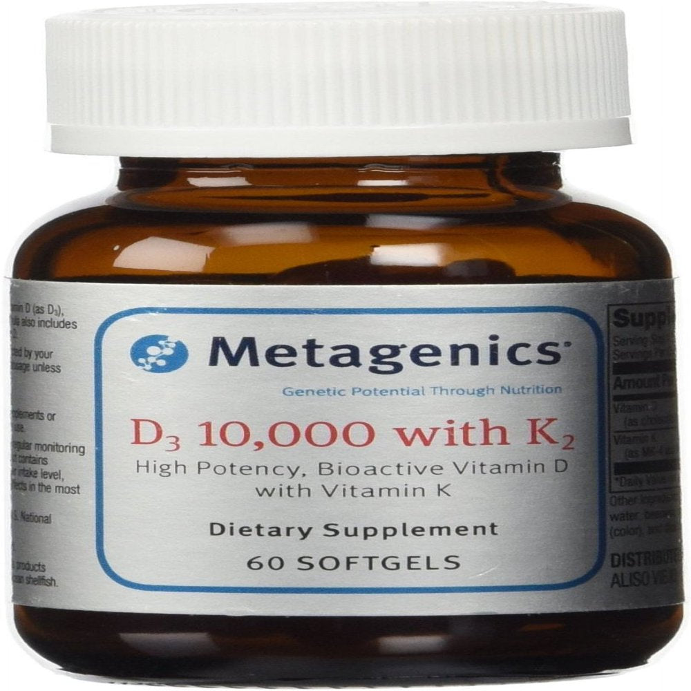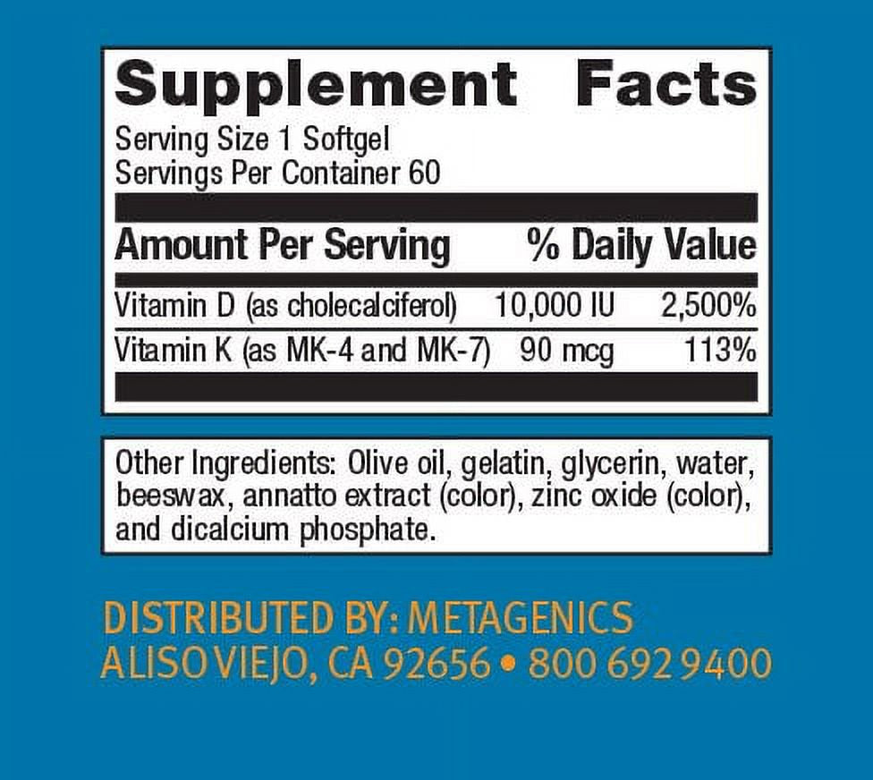 D3 10,000 with K2 provides 10,000 IU per softgel of vitamin D (as D3), designed for greater absorption. This high potency formula also includes bioavailable forms of vitamin K2 to complement vitamin D.