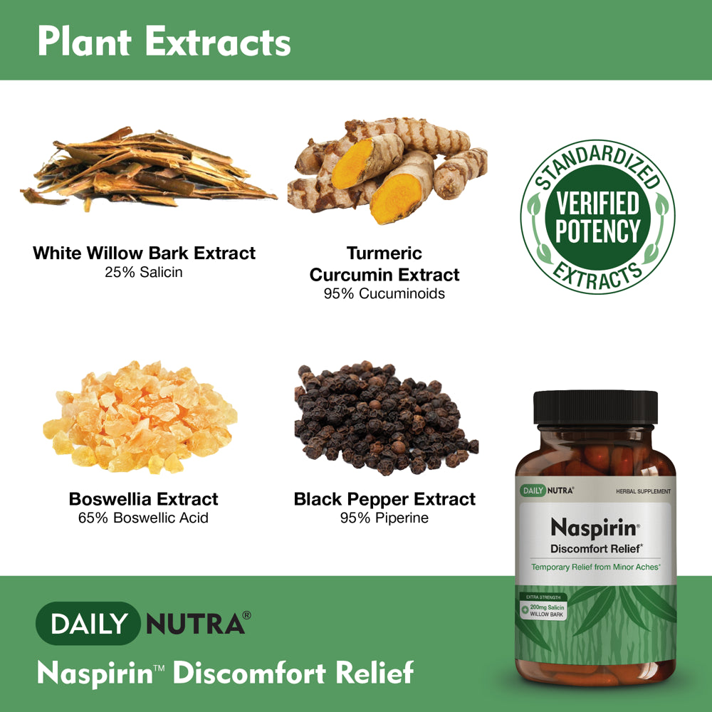 Dailynutra Naspirin Willow Bark Formula, Natural Relief for the Head, Back, Shoulder, Neck, Knees, and Joints, White Willow with Turmeric and Boswellia Extract (60 Capsules)
