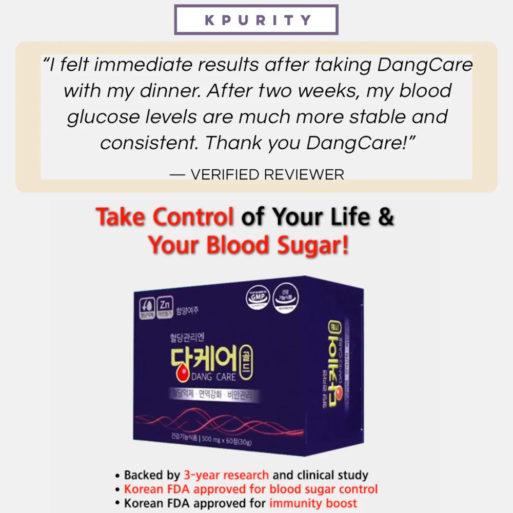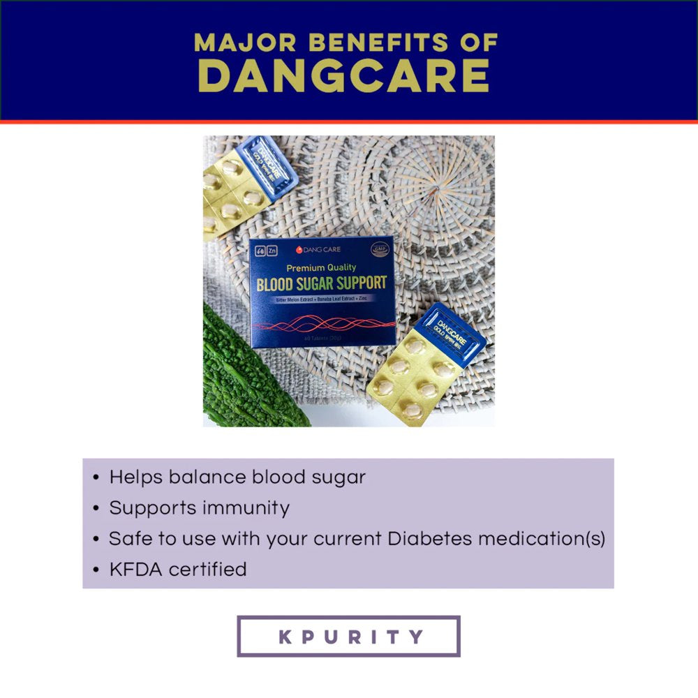DESCRIPTIONWhat is DangCare? DangCare is an all-in-one premium glucose supplement that supports balanced blood glucose, metabolism, and immunity. The unique combination of Hamyang Bitter Melon extract and Banaba Leaf extract is crafted to help reduce glucose absorption and glucose production by your body. ✨ What Makes DangCare Different? Each box contains 60 tablets, packed in sheets of Dangcare tablets can help: