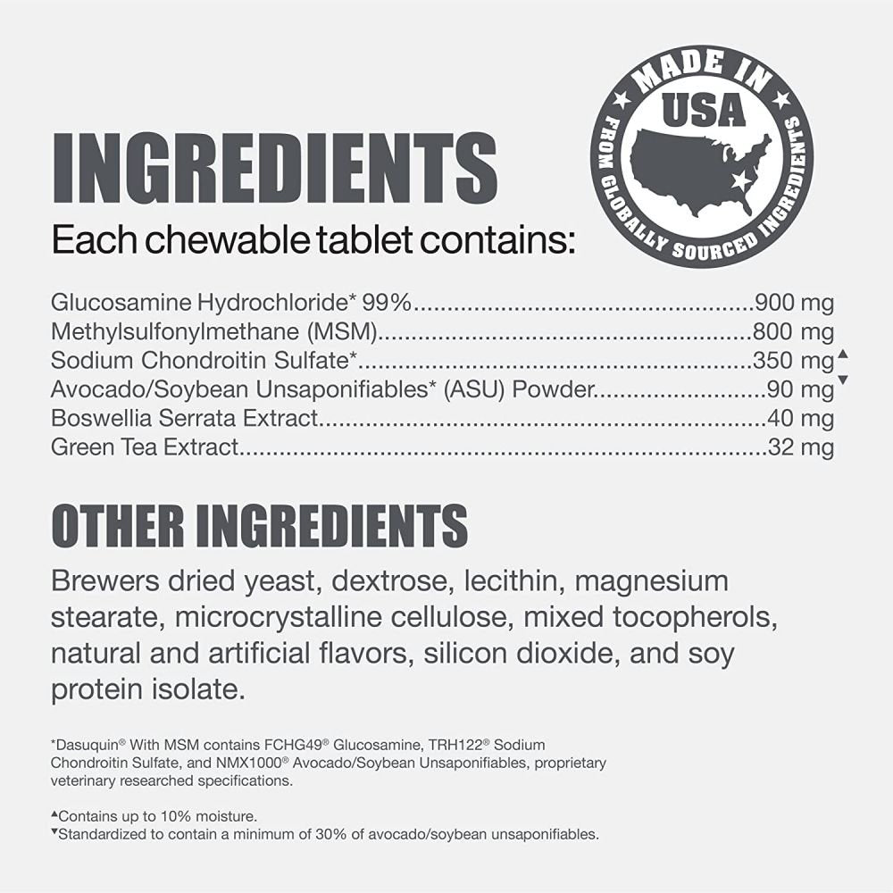 Dasuquin with MSM Chewable Tablets for Large Dogs is a premium joint health supplement that contains the combination of glucosamine hydrochloride, chondroitin sulfate and avocado/soybean unsaponifiables (ASU) to help support your pet’s joints. Each chewable tablet also contains methylsulfonylmethane (MSM), a source of sulfur, which helps support joint health. Dasuquin joint health supplements are brought to you by Nutramax Laboratories Veterinary Sciences, the #1 veterinarian recommended supplement company. ▼Source: Among veterinary brands. Survey conducted among small animal veterinarians who recommended oral joint health supplements. *Source: Survey conducted among small animal veterinarians who recommended animal supplements.