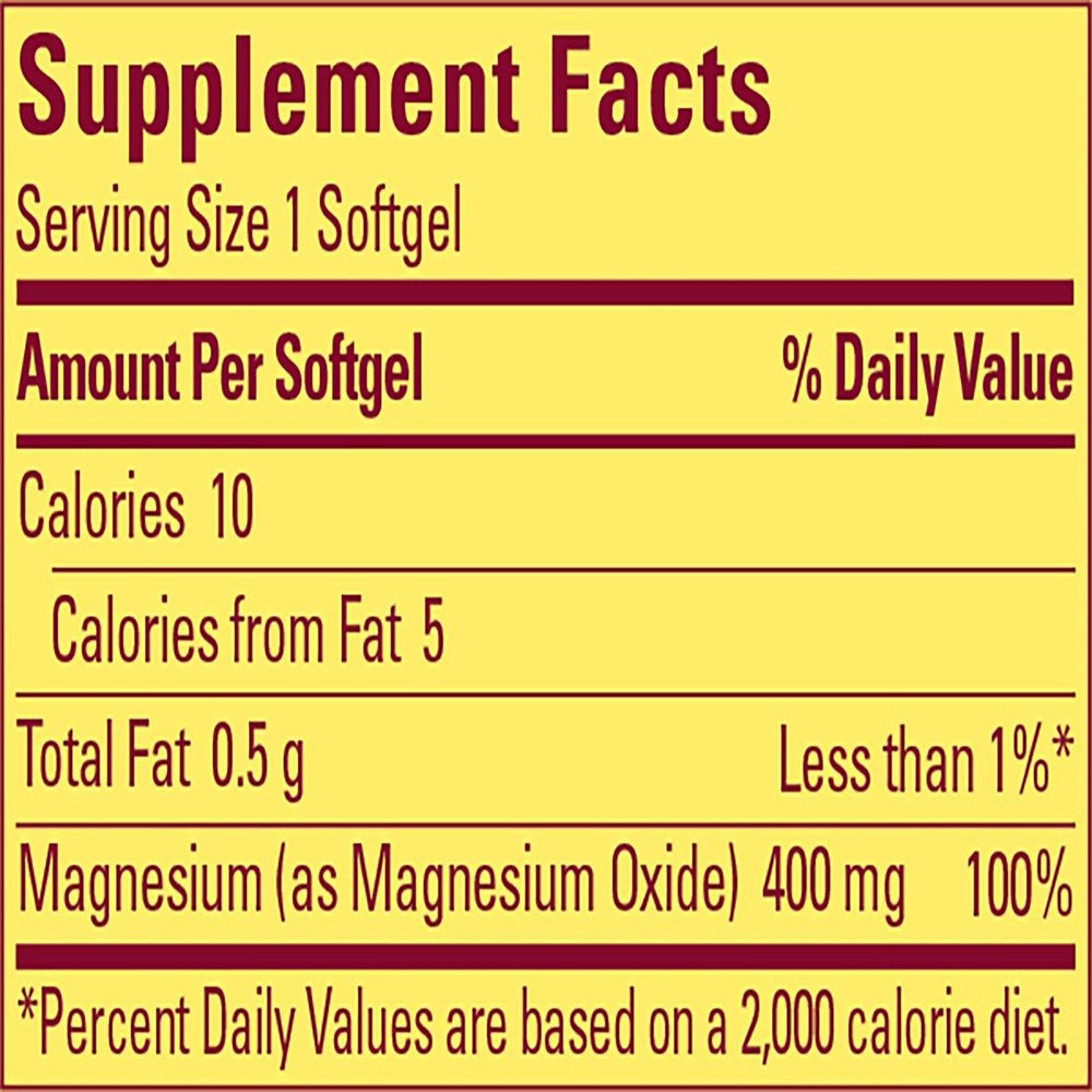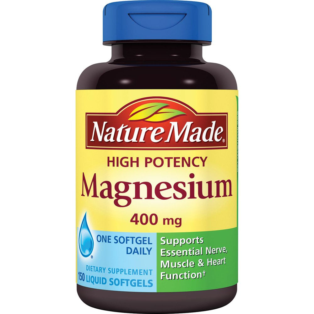 Trust Nature Made Magnesium 400 mg easy to swallow softgels to your magnesium supplement needs. According to The National Health and Nutrition Examination Survey (NHANES), 50% of the US population has inadequate dietary intake of Magnesium. Magnesium participates in more than 300 reactions in the body and is critical to many bodily functions such as promoting a steady heart rhythm, keeping bones strong, and converting carbohydrates, protein, and fat into energy. ?These statements have not been evaluated by the Food and Drug Administration. This product is not intended to diagnose, treat, cure or prevent any disease.