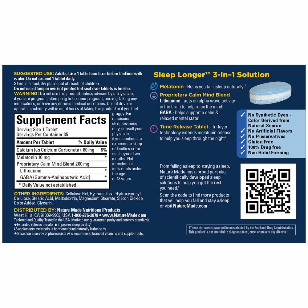 Who says dreams can’t happen overnight? Nature Made Sleep Longer™ combines Melatonin, L-theanine, and GABA into one tablet, to help you calm your mind, fall asleep faster, stay asleep longer, and improve sleep quality.(2) These Melatonin 10mg tablets use a tri-layer, time release technology to help provide just the right amount of Melatonin at the right time—to help you fall asleep naturally and sleep through the night.(1) L theanine is a naturally occurring amino acid found in green tea that acts on alpha brain wave activity to help relax the mind. GABA acts as a neurotransmitter in the brain to help support a calm and relaxed mental state. While other GABA supplements may also contain L-theanine or Melatonin, Sleep Longer is from the #1 pharmacist recommended vitamin and supplement brand.(3) Get the sleep you’ve been dreaming of, with Nature Made Sleep Longer.™ (1)Supplements melatonin, a hormone found naturally in the body. (2)Extended release melatonin improves sleep quality. *Based on a survey of pharmacists who recommend branded vitamins and supplements.