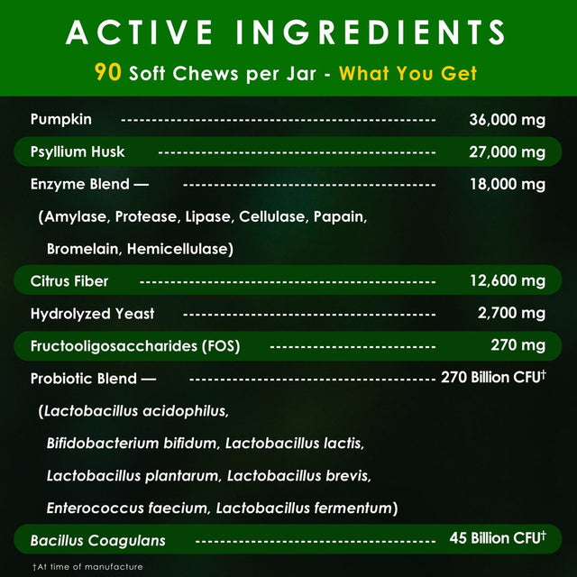 - ELEVATE YOUR PET'S WELLNESS: Our soft chews are a cutting-edge digestive health and immune system booster, featuring 8 potent probiotic strains, 7 digestive enzymes, and prebiotics enriched with natural ingredients like pumpkin, psyllium husk, citrus fiber, and hydrolyzed yeast, promoting robust digestive health and immune support.