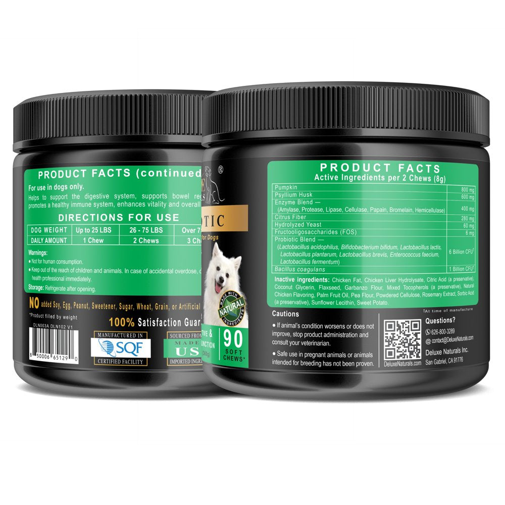 - TRUSTED BRAND, QUALITY ASSURED: Our probiotic soft chews are proudly made, adhering to stringent quality and safety standards in a level 3 SQF certified facility. Join the ranks of thousands of satisfied dog owners who trust Deluxe Naturals for their furry companion's well-being.