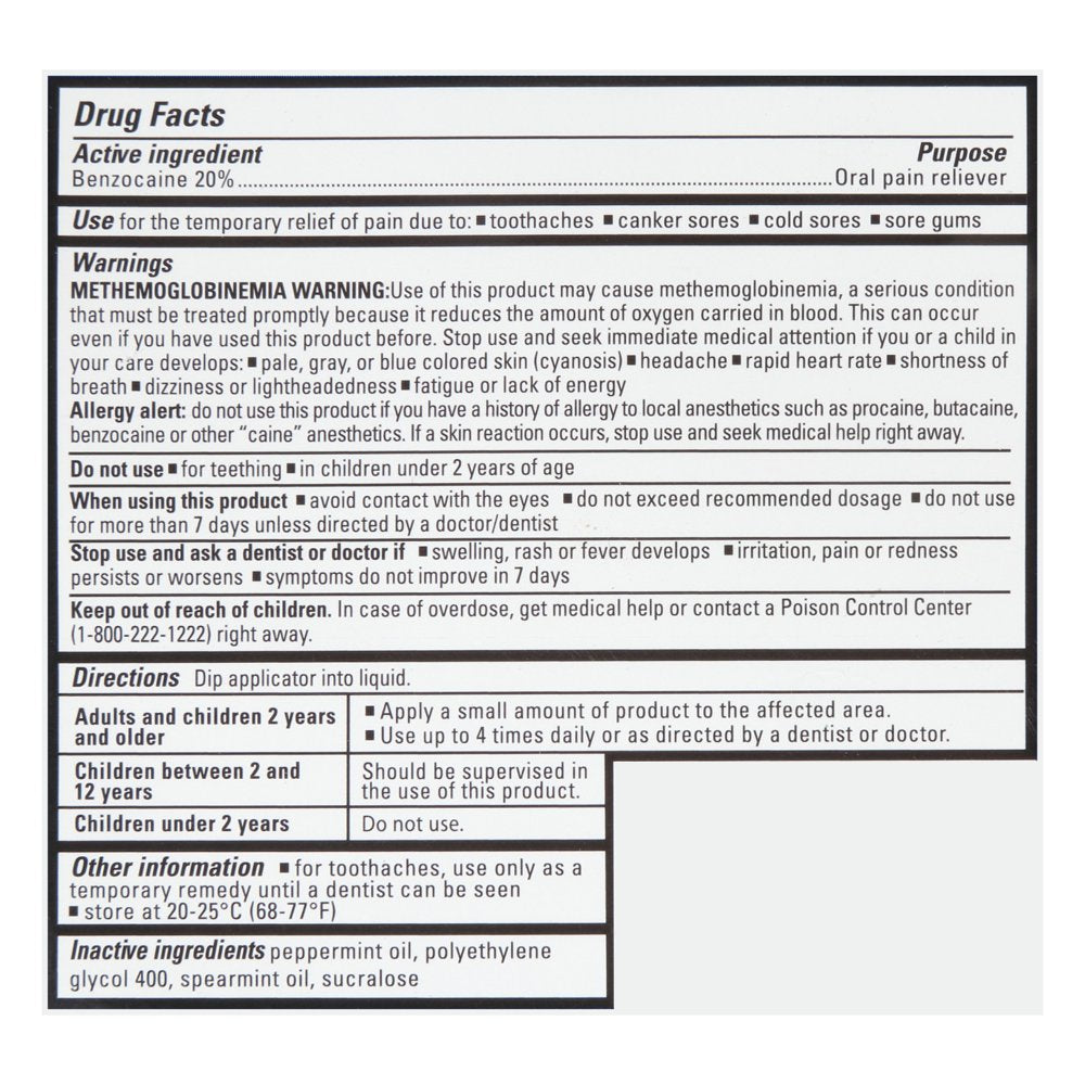 - Fresh Mint flavored Benzocaine relieves tooth pain, sore gums and mouth sores
