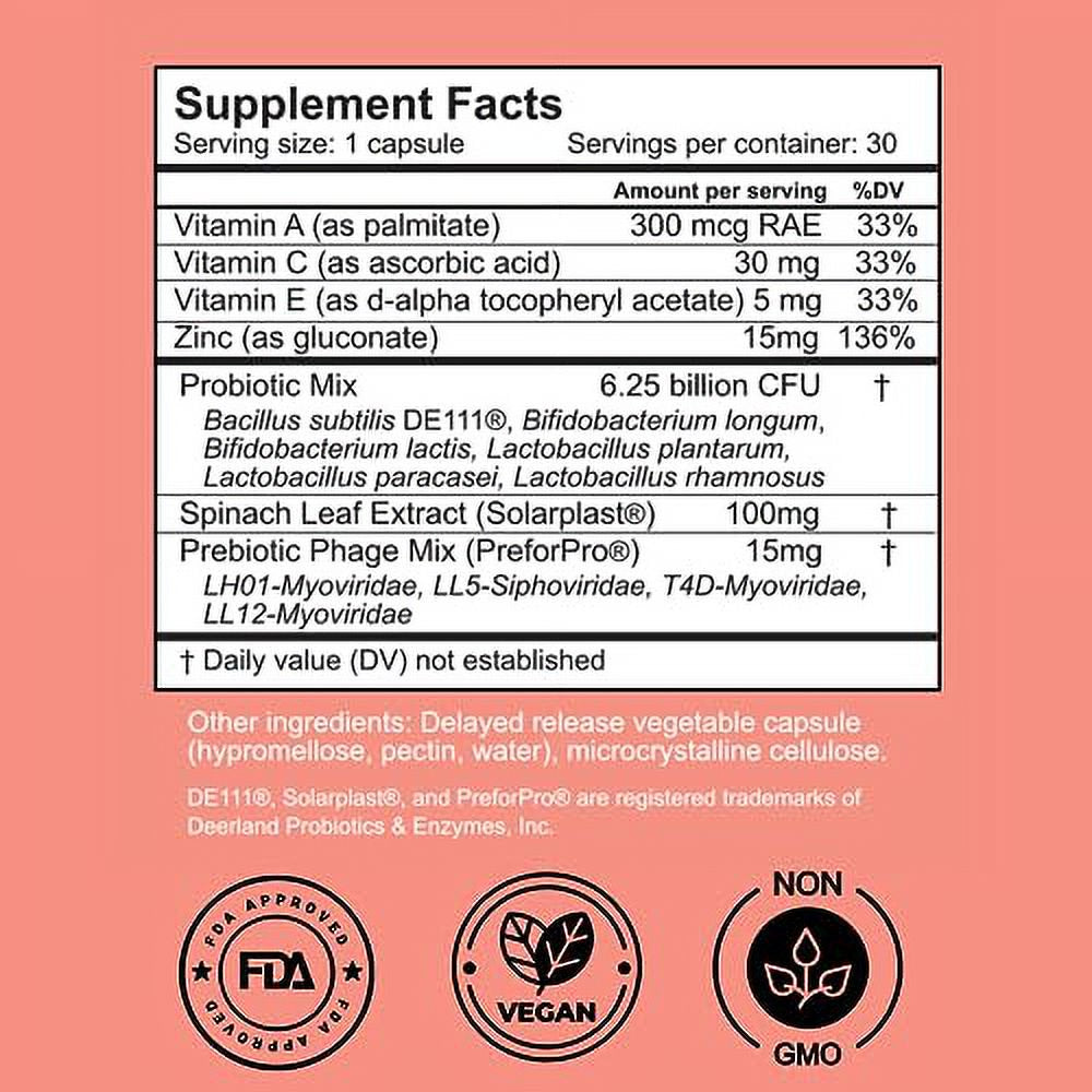 Prebiotic Mix, Probiotic Mix, Zinc, Vitamins A, C, E, Spinach leaf extract