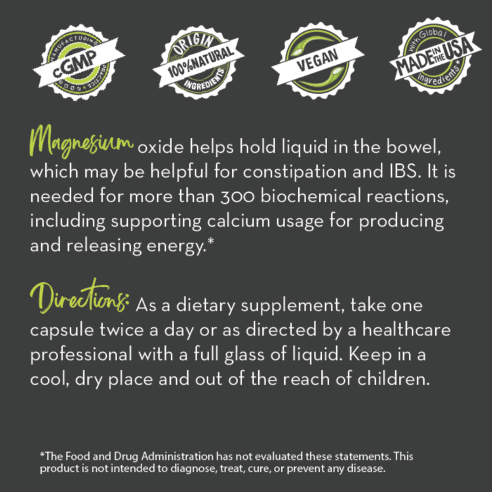 Desert Harvest Magnesium Oxide supports digestive health and bowel regularity. We recommended taking equal amounts of Magnesium to Calcium to avoid constipation. Magnesium is essential for healthy bones, joints, nerves, muscles, heart rhythm, metabolism, blood sugar, natural energy production, growth, and overall well-being.