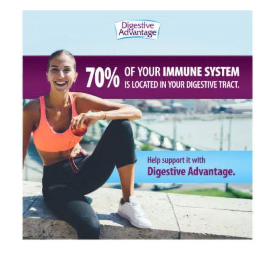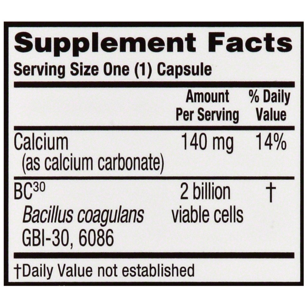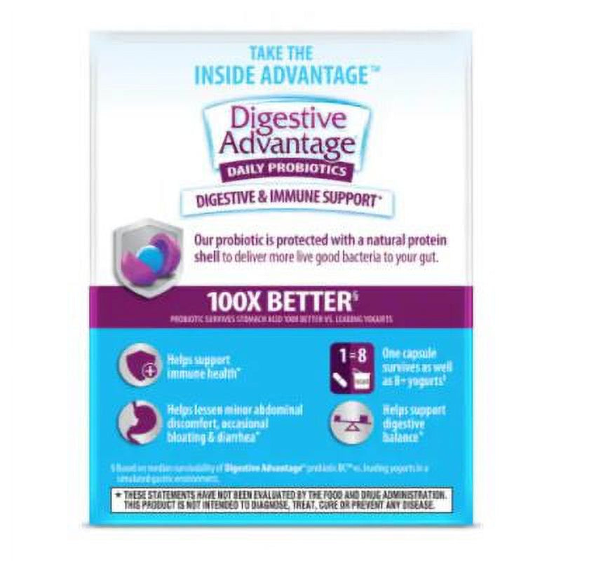 - Pack of 2 for the UPC: 020525181671 Heading Purpose Dietary Supplement Manufacturer Reckitt Active Ingredients One (1) Capsule: Calcium (as Calcium Carbonate) 140 mg; BC30 Bacillus Coagulans GBI-30, 6086 2 billion viable cells (At time of manufacture) *Daily value not established Directions Adults 18 and over: Take one capsule daily with water. Store in a cool, dry place. Inactive Ingredients Maltodextrin; Hypromellose; Water; Magnesium Stearate; Titanium Dioxide; Microcrystalline Cellulose; Silicon Dioxide; Chlorophyllin Uses To support good health, choose digestive advantage daily!* This product targets your specific digestive health needs and, with continued use, gives you long-term digestive support.* That's because it contains BC30, a natural probiotic that survives 10x better than yogurt to deliver good bacteria where you need it.+ Probiotics are beneficial bacteria that live in your digestive tract and promote digestive and immune health.* Many other probiotics don't survive the harsh acidic stomach environment. Because Digestive Advantage reaches your intestines alive, it is able to provide digestive and immune health benefits where you need them.* Digestive Advantage Daily Probiotic helps lessen minor abdominal discomfort, bloating and may relieve occasional diarrhea.* +Based on median % survivability of Digestive Advantage vs. probiotic supplements and 20 probiotic yogurts in simulated gastric pH for 2 hours. Survivability and delivery of probiotic cells to the small & large intestines is one of several factors influencing overall product effect. *These statements have not been evaluated by the Food and Drug Administration. This product is not intended to diagnose, treat, cure or prevent any disease. Warnings KEEP OUT OF REACH OF CHILDREN. NOTE: If pregnant, lactating or on prescribed medication, consult your physician before using. Contains soy. hide