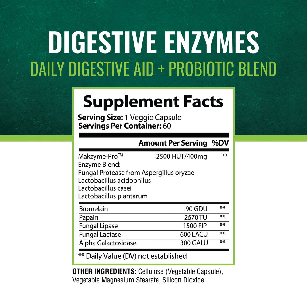 Our digestive enzyme capsules contain a specific blend of plant-sourced enzymes, prebiotics, and probiotics that improve the daily digestive health for men and women. By helping the body digest fats, proteins, carbohydrates, and cellulose, this advanced formula makes the digestive process a breeze for your body and even increases nutrient absorption!