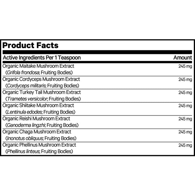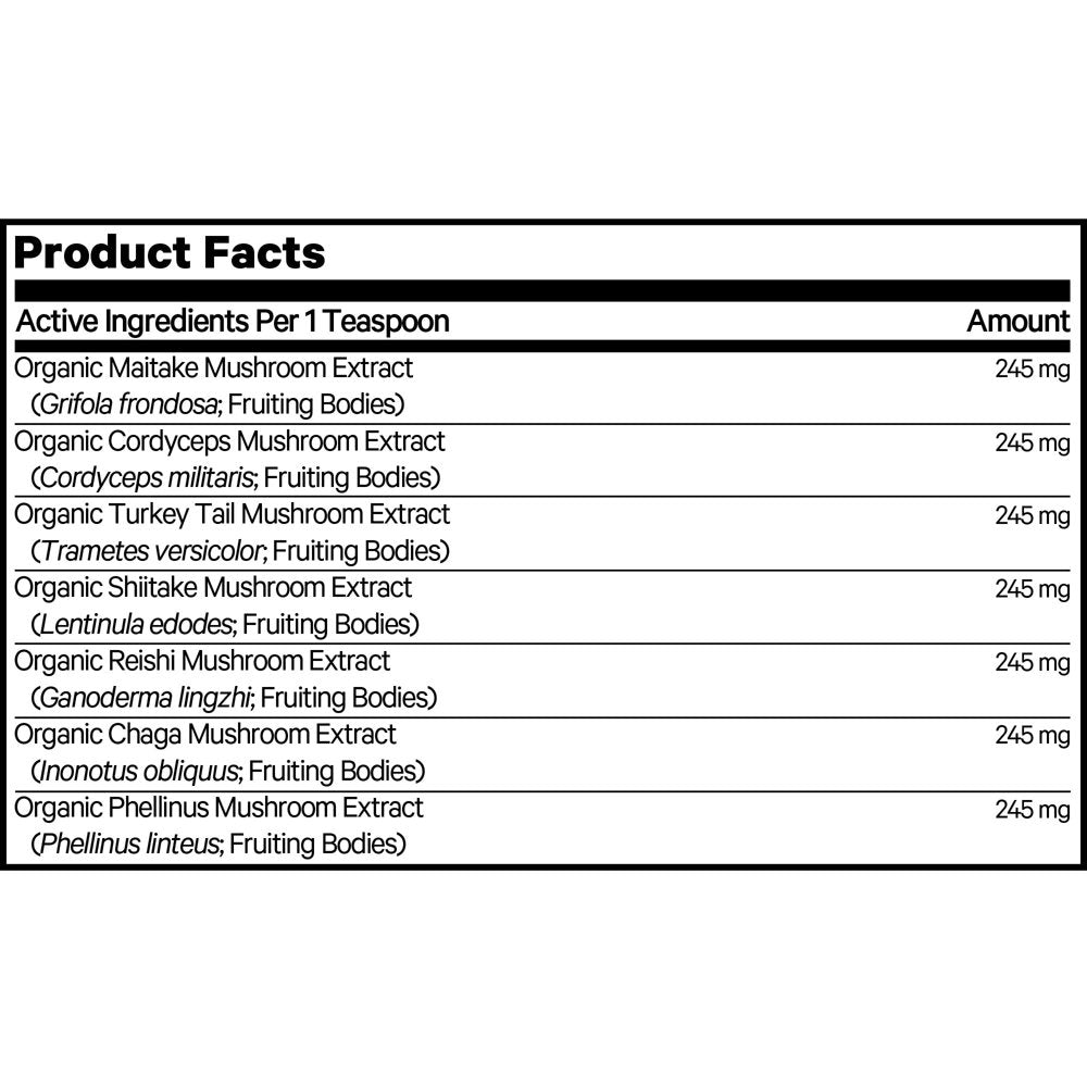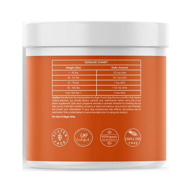 - Full-Spectrum 7 Organic Mushroom Complex: This defense immune support formula for dogs contains a blend of different mushrooms including maitake, cordyceps, turkey tail, shiitake, reishi, chaga, and phellinus; each serving of one teaspoon delivering 245 mg per mushroom variety for pets.
