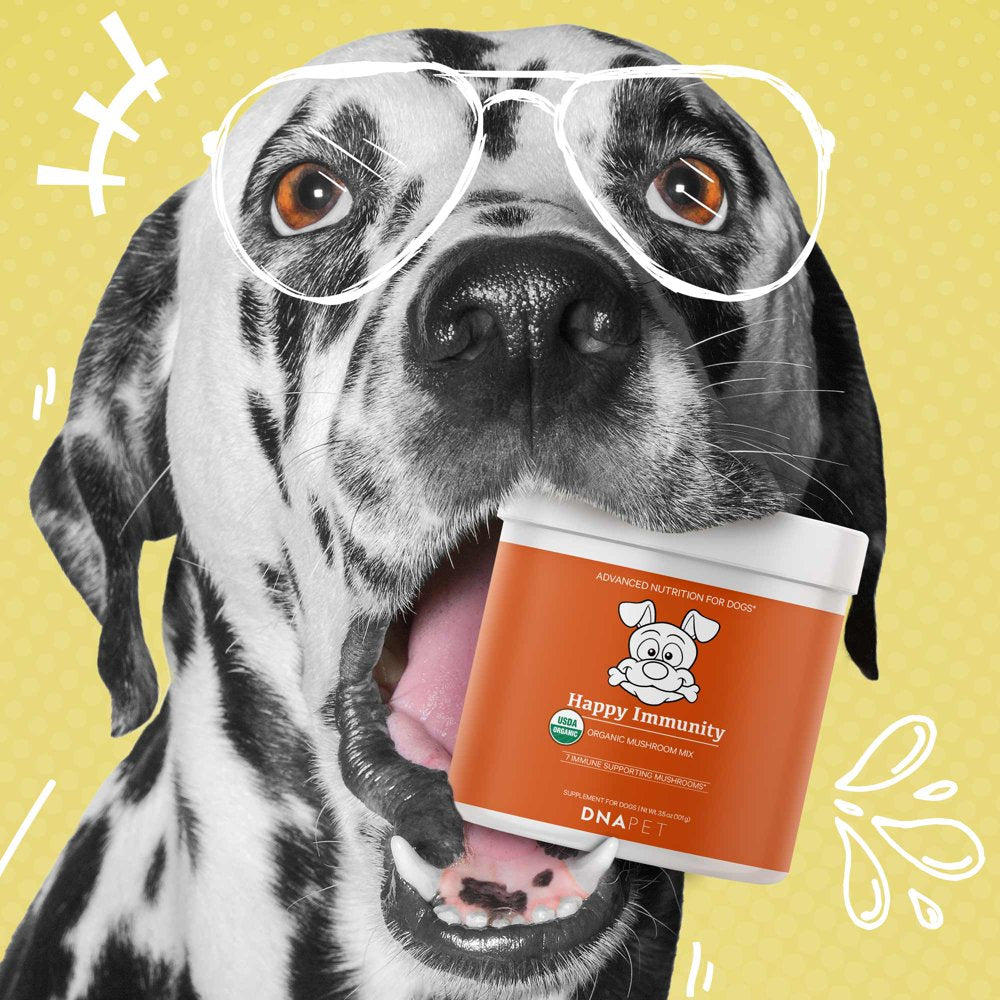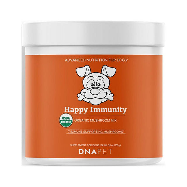 - USDA Organic Mushroom Powder Mix: Happy Immunity is a certified organic mushroom complex dog supplement with a selection of seven mushroom fruiting bodies extracts delivered all in one in a powder form. With its organic certification under USDA organic standards, DNA PET USDA organic mushroom powder mix offers a unique guarantee for quality for your pet.
