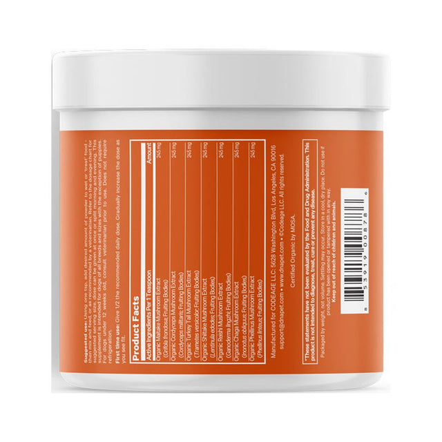 - Manufactured in the USA, Vegan & Non-GMO: Codeage DNA PET immunity mushroom powder solution is vegan, non-GMO and manufactured in the USA in a cGMP certified facility. This superfood mushroom blend for dogs does not contain artificial flavors, colors or artificial ingredients. Third-party tested.