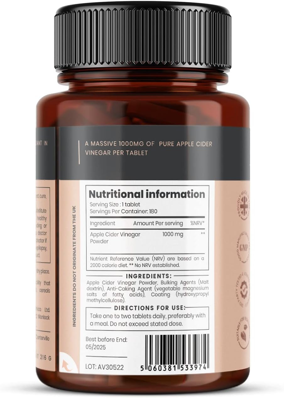 - ALL OF THE BENEFITS WITHOUT THE BAD TASTE Those familiar with Apple Cider Vinegar liquid will be well aware that even when diluted it has a very strong and rather unpleasant taste. Not only that, its acidic nature means that it has the potential to cause damage to the oesophagus and teeth of sensitive individuals. By using our convenient tablets you can avoid all of the unpleasantness and ensure that the Apple Cider Vinegar reaches your stomach safely and efficiently.