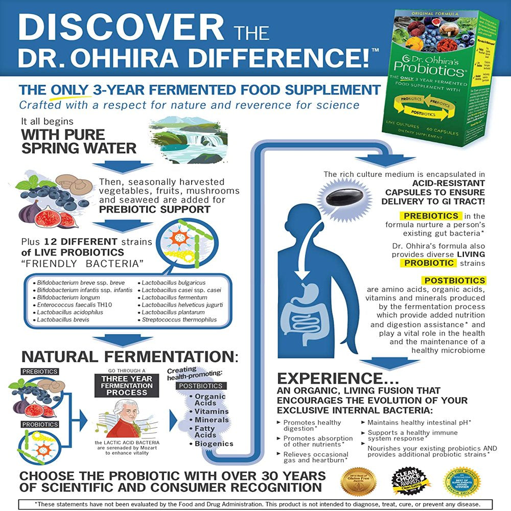 - THE DR. OHHIRA'S ORIGINAL PROBIOTIC capsule contains prebiotics (the fruits and vegetables) with strong and effective probiotic bacteria (12 strains) and postbiotic metabolites that the probiotic bacteria have been producing during three years of fermentation, including vitamins, amino acids, short-chain fatty acids (SCFAs), immune system-enhancing compounds, detoxifying agents and many other beneficial substances which support digestive function, whole health and improve the pH of your colon.