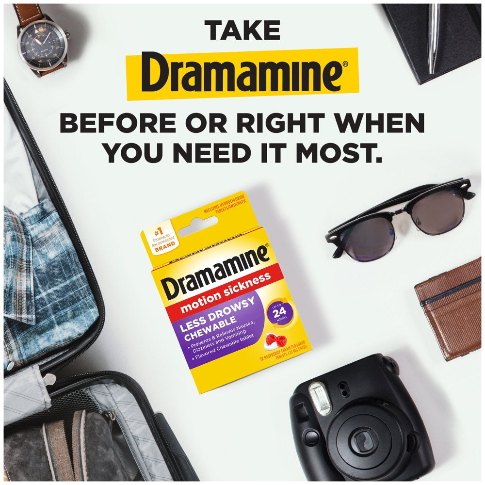 Get powerful, fast relief from motion sickness when you need it most from the number 1 pharmacist-recommended brand!* Dramamine Motion Sickness Less Drowsy Chewable tablets not only treat symptoms on the spot they also prevent nausea, dizziness and vomiting for up to 24 hours with less drowsiness. Dramamine Less Drowsy Chewable tablets treat symptoms with a long-lasting formula in a convenient, raspberry cream flavored chewable tablet. Easy to take wherever your adventure takes you. Dramamine is a vacation essential in your travel medicine bag. Don't let motion sickness affect your plans on your next cruise, theme park visit or road trip. Dramamine fits with your other travel size toiletries and travel must haves. If you know you are going on an adventure that is likely to cause motion sickness and nausea, take Dramamine Less Drowsy BEFORE the trek. Also, be sure to drink plenty of water and avoid alcohol, which can increase dehydration and nausea. Take Dramamine and Take Control. For adults and children 6 and older. See packaging for dosing instructions and warnings. *Named by Pharmacy Times and U.S. News & World Report as #1 Pharmacist-Recommended Brand for 2022 Motion Sickness Remedies Category.