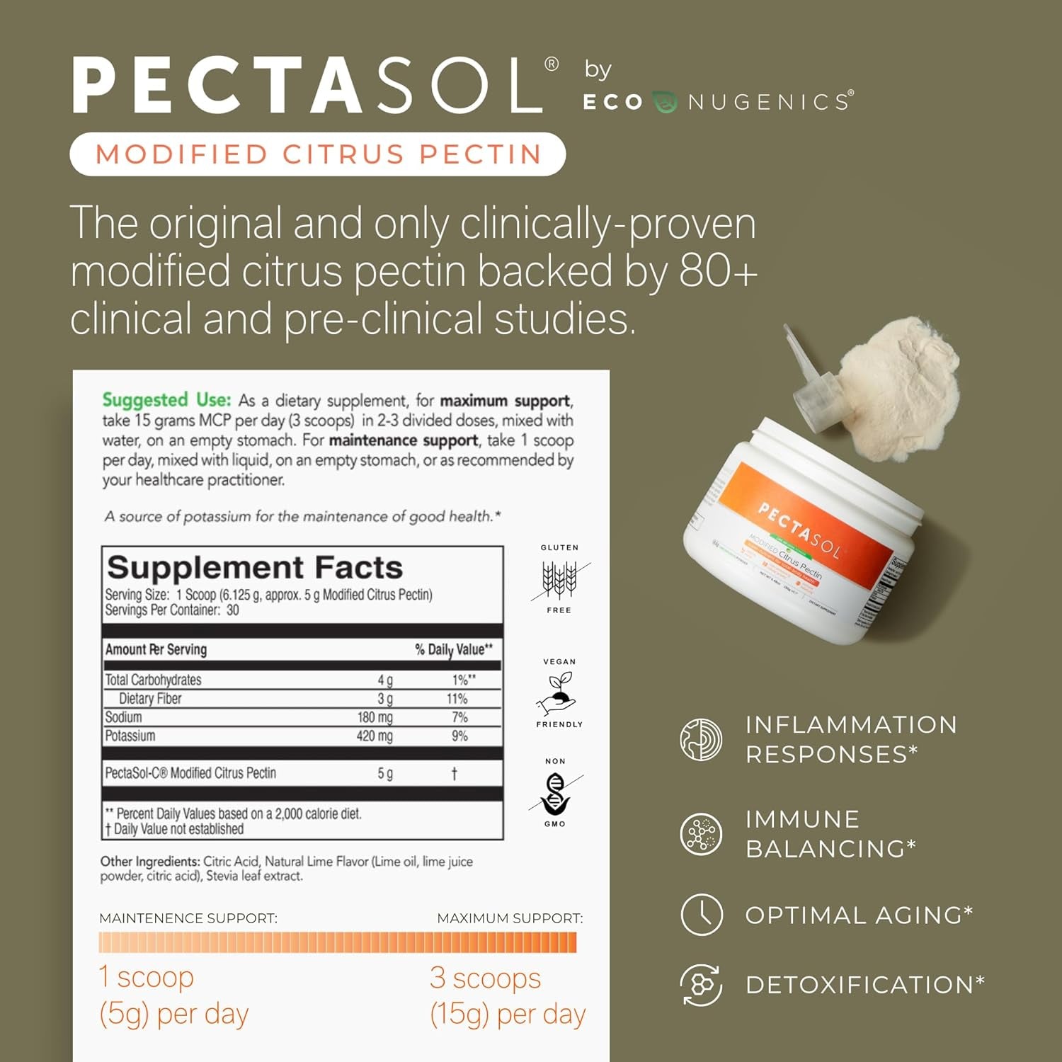 - SUPPORT YOUR HEALTH AND FEEL GREAT 🍋 ecoNugenics PectaSol MCP is the most important dietary health supplement for long-term health, oncology support and aging. Safe for all ages, PectaSol provides a simple and all-natural method for supporting numerous critical areas of health because of its ability to naturally block the effects of excess Galectin-3 throughout the body