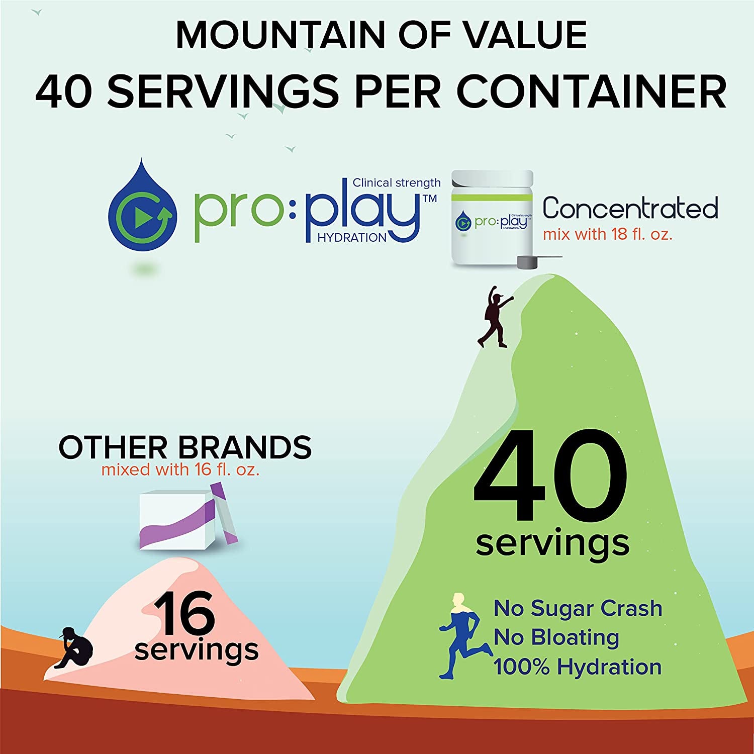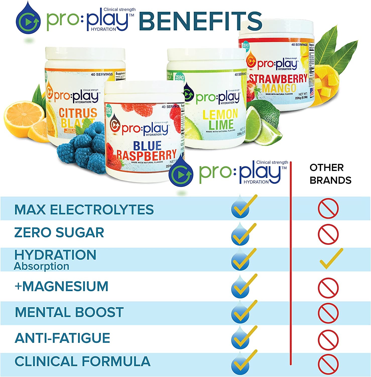 - REHYDRATE FAST: With 3X more electrolytes than the leading hydration supplement on the market, pro: play is the delicious, sugar free way to get fast dehydration relief while you work.