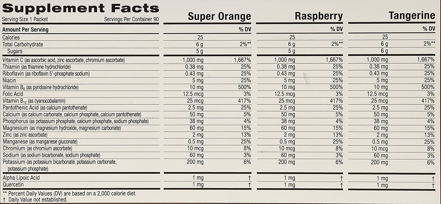 - Includes 90 packets of Emergen-C Flavors: Super Orange. Raspberry, Tangerin