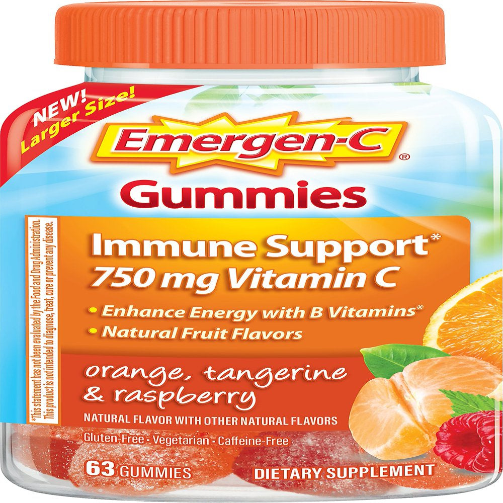 Emergen-C 750Mg Vitamin C Gummies for Adults, Immune Support with B Vitamins, Gluten Free, Orange, Tangerine and Raspberry Flavors - 63 Count