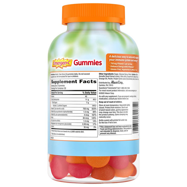 Emergen-C 750Mg Vitamin C Gummies for Adults, Immunity Gummies with B Vitamins, Gluten Free, Orange, Tangerine and Raspberry Flavors -90 Count