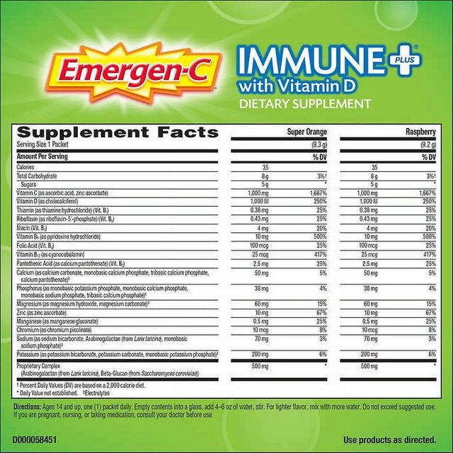 Emergen-C Immune+ (70 Ct.) - System Support Dietary Supplement Drink Mix with Vitamin D, 1000Mg Vitamin C - 70 Packets (30 - Raspberry Flavor, 40 - Super Orange Flavor)
