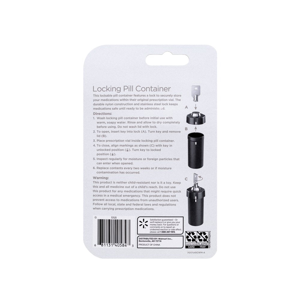 The Equate Locking Pill Container Canister features a lock to secure your meds within their original vial. The durable nylon canister and stainless-steel lock keeps pills safe. Its compact size makes it ideal to take with you when you're on the go. Keep your important meds safe and easily accessible with the Equate Locking Pill Container. Locking Portable Pill Organizer.